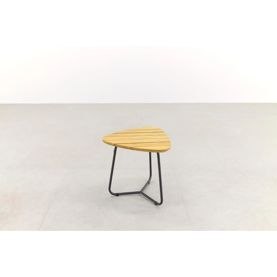 Een variatie op de voorgaande ‘Axel’ bijzettafel serie. Deze populaire serie is in een nieuw jasje gestoken. Dit keer met natuurlijk teakhout in plaats van teakhout met een greywash. Op deze manier is deze tafel met bijna alle loungesets te combineren. Het frame is van RVS, een materiaal met een lange levensduur. Ter bescherming is het roestvast staal gecoat met een matte antraciet kleur. Het teakhouten tafelblad zorgt voor een warme uitstraling. Houd er rekening mee dat natuurlijk teakhout nog zal gaan werken door middel van de weersinvloeden. Hierdoor zal het hout grijzer worden en komen er kleine barstjes en scheurtjes in. Dit maakt je tafel nog stoerder en heeft geen negatief effect op de kwaliteit van de tafel!