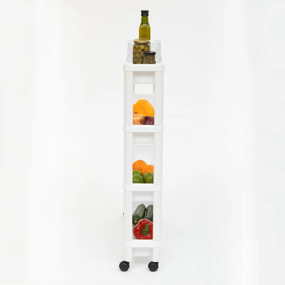 5Five Keuken/badkamer smalle opberg trolley karretje met 4 lagen/bakjes/mandjes. Afmetingen: L37 x B15 x H79 cm. Kleur: wit. Materiaal: PP kunststof. Deze trolley is makkelijk uitneembaar(kliksysteem) zodat het minder ruimte inneemt. Het karretje is voorzien van wielen en heeft 4 mandjes niveaus met opstaande rand. Gebruik de trolley in de keuken of badkamer om spullen op te bergen. Een must-have voor in ieders huishouden.