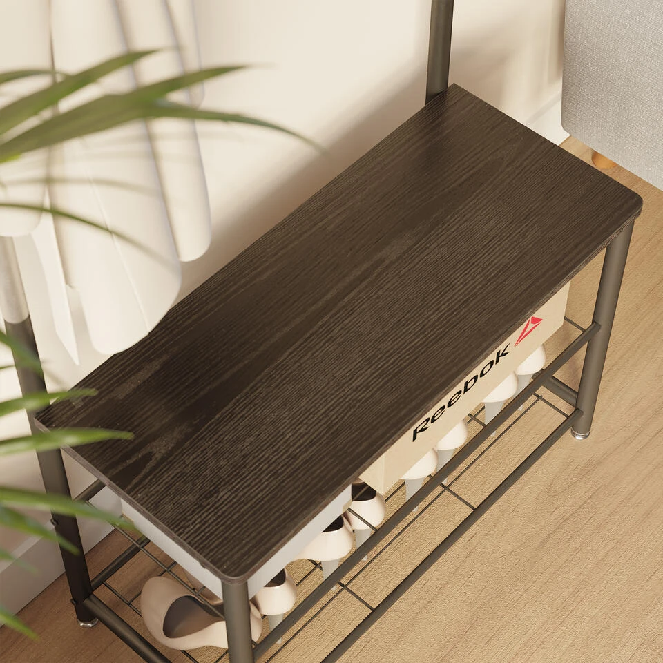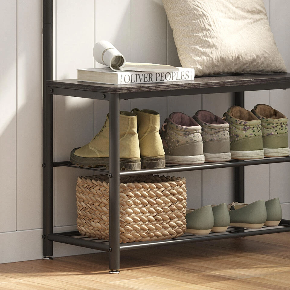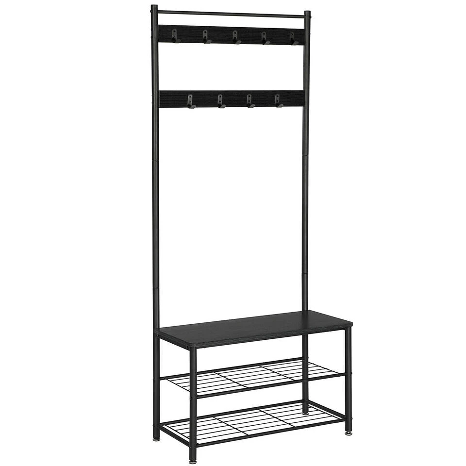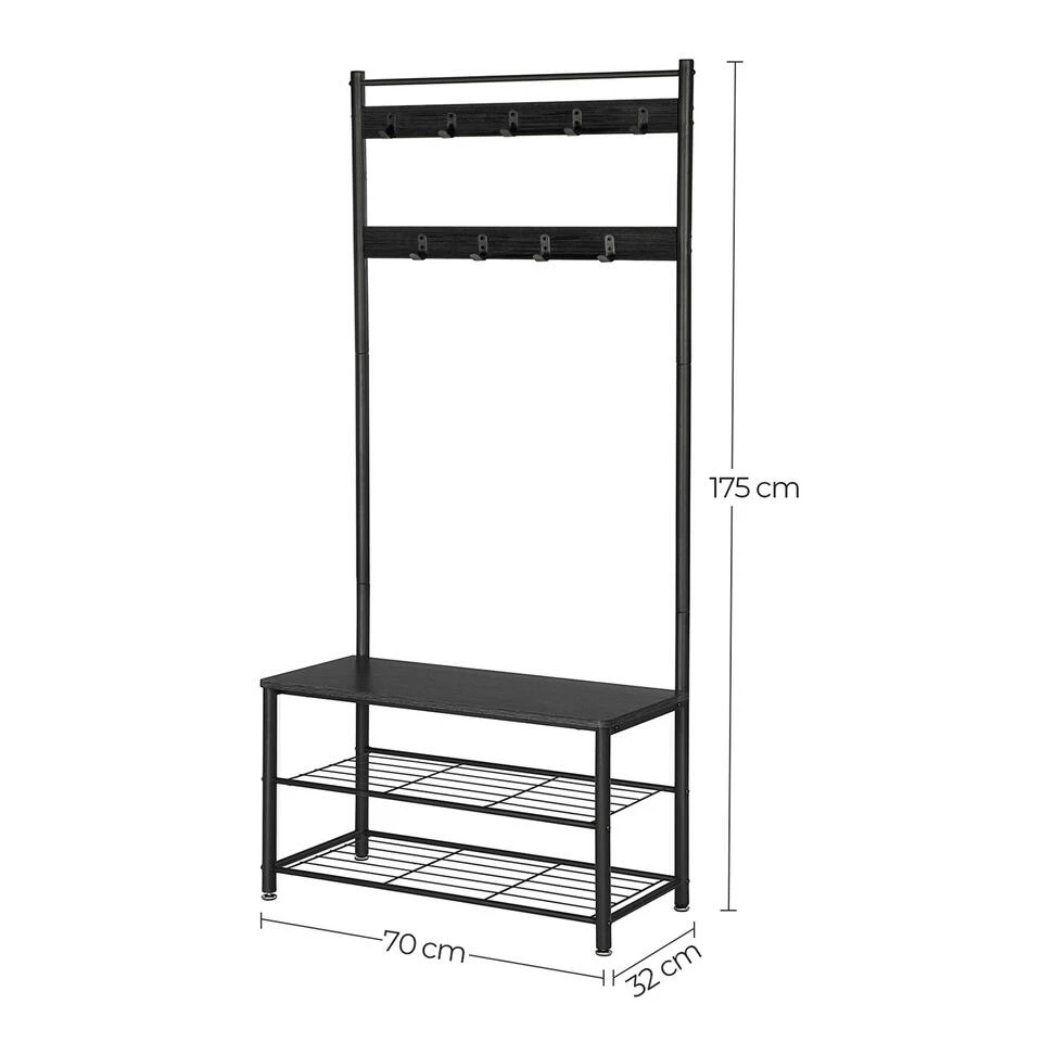 Naast de functie van kapstok beschikt dit kledingrek ook over een verzamelruimte voor schoenen. Twee metalen schappen voorzien u ruimte voor zo’n acht paar schoenen. Het gehele schoenenrek draagt tot 80 kg terwijl de haken elk 3 kg draagcapaciteit beschikken. Het spreekt voor zich dat dit type rek uitermate interessant is voor zij die houden van efficiëntie. Jassen en schoenen worden voortaan immers op één en dezelfde plaats verzameld.