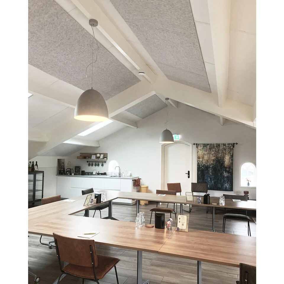 De PET-vilt panelen kunnen met dubbelzijdige tape of met MS-polymeerkit aan de muur bevestigd worden. Dit werkt het beste op gladde, stofvrije oppervlakken. Voor bevestiging aan het plafond adviseren wij het gebruik van kit.