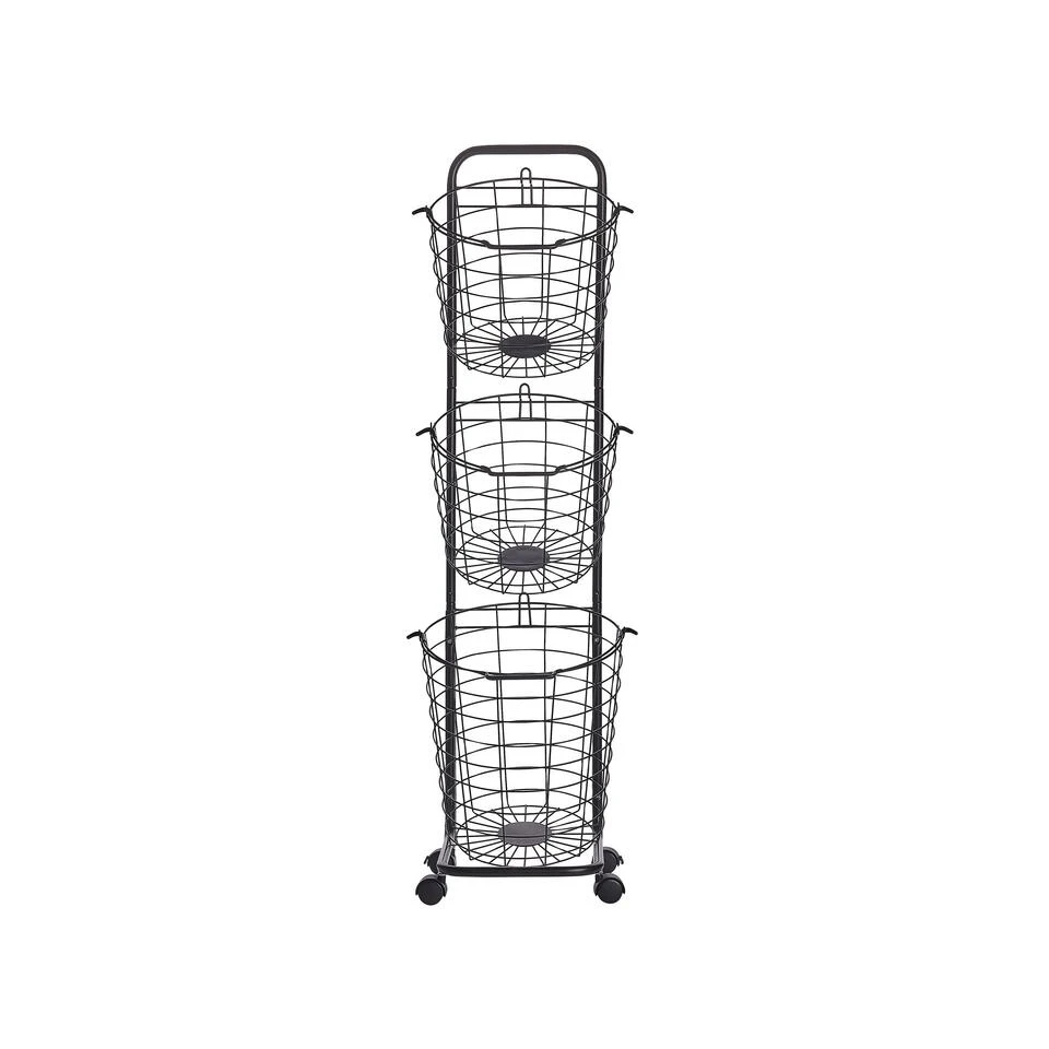 Zwarte mandstandaard in een set van 3 op wielen. Mis je een beetje opbergruimte in de badkamer of in de keuken? Wil je je keukengerei, handdoeken en kleine voorwerpen altijd bij de hand hebben? Dan is deze mandstandaard voor jou gemaakt. De drie ronde manden van gepoedercoat metaal zijn extreem ruim en kunnen ook los van de standaard worden verwijderd. Dankzij de bijgevoegde kunststof wieltjes is de standaard gemakkelijk overal te plaatsen.