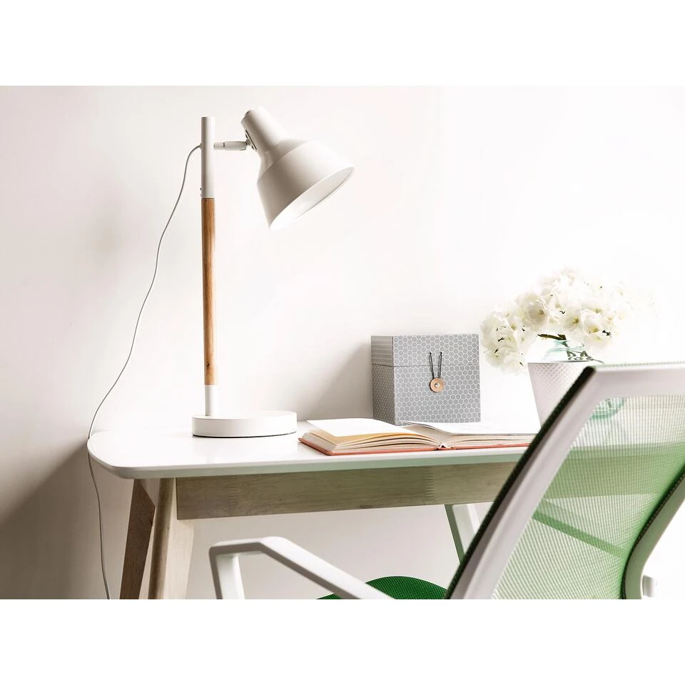 Decoratieve houten tafellamp. De combinatie van licht hout en wit metaal geeft de tijdloze tafellamp een heldere, vriendelijke en natuurlijke uitstraling. De ronde voet van de lamp zorgt voor een stevige en veilige stand en de verstelbare lampenkap verlicht precies de gewenste locatie. De trendy tafellamp is praktisch, functioneel en veelzijdig. Het kan worden gebruikt als een praktische tafel- of bureaulamp, als een moderne bedlamp of als een decoratief leeslampje.