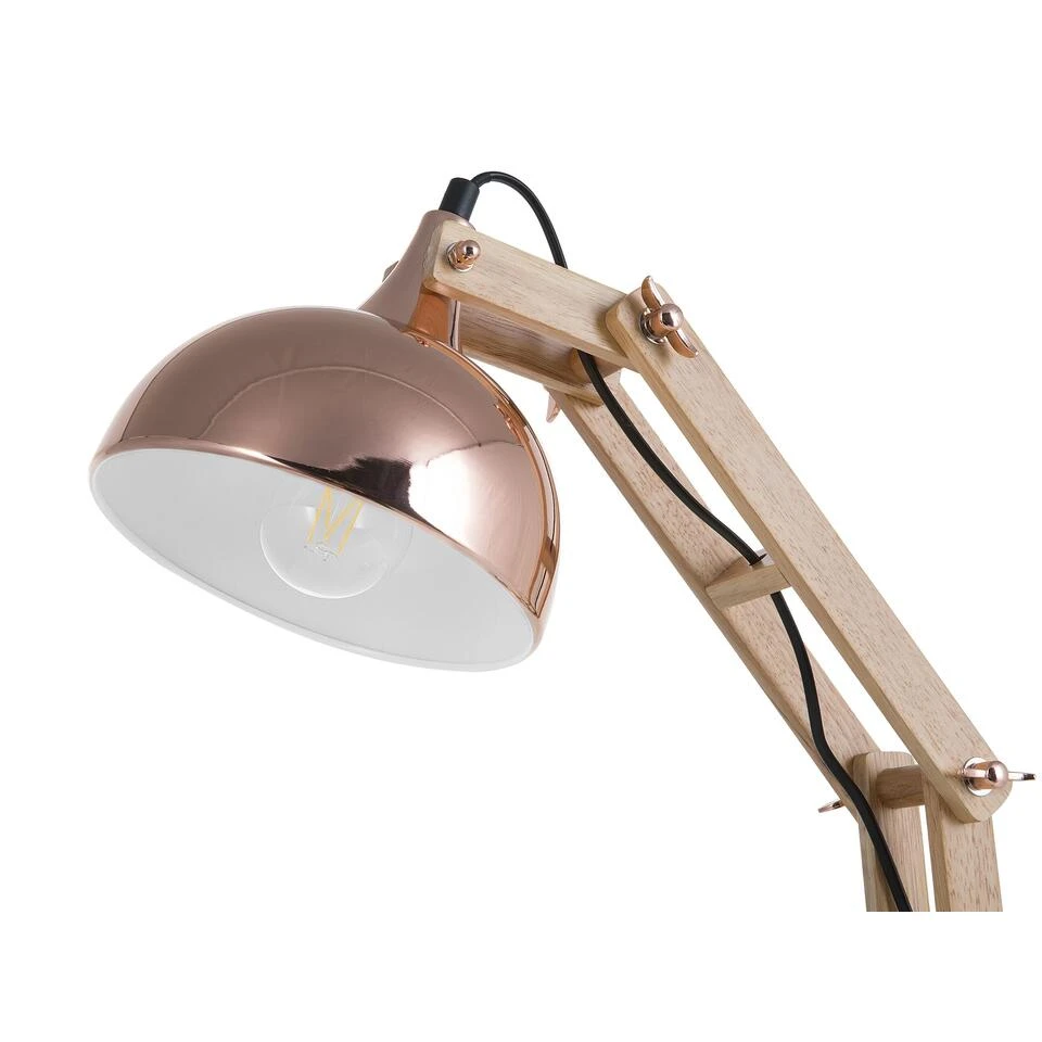 Trendy bureaulamp in koper . Deze bureaulamp past perfect in elk modern interieur. Het trendy, industriële design is voorzien van een slim mechanisme waarmee je de lichthoek precies naar jouw wensen kunt aanpassen. De natuurlijke houtkleur en de vorm maken het onthulde koord eerder een complementair accent dan een lelijk probleem. De voet en de kap van de bureaulamp zijn gemaakt van onderhoudsvriendelijk metaal in een bijpassende koperkleur. Deze bureaulamp past niet alleen in je werkkamer, maar zal ook zeker een statement zijn in elke moderne woonkamer of slaapkamer.