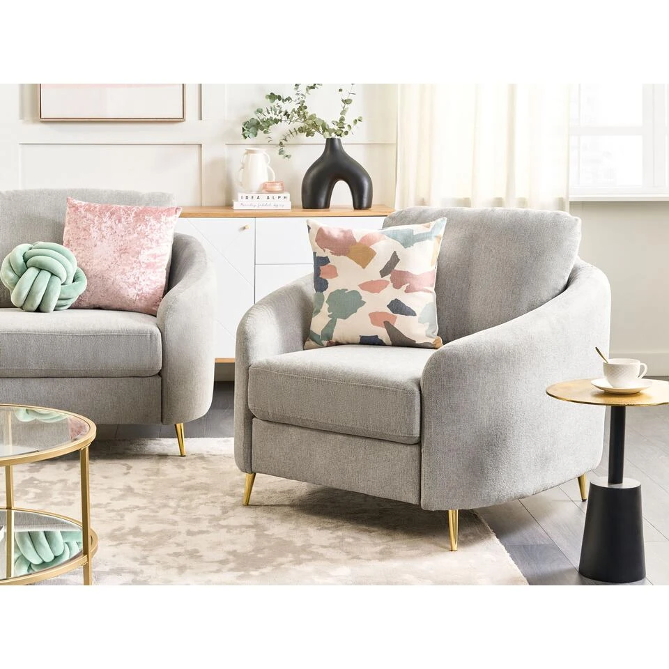 Glamour stijl loungestoel. Ontspan in deze comfortabele en unieke fauteuil met gebogen vorm die een gezellige sfeer in je interieur zal brengen. De dik gewatteerde kussens en het fluffy rugkussen zorgen voor een hoog gebruikscomfort. De gouden metalen poten complimenteren de unieke kleur van de stoffering en voegen een elegant en glamoureus gevoel toe aan het ontwerp.