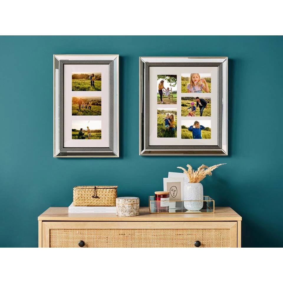 Gespiegelde decoratieve fotolijstcollage voor 5 foto’s. Versier de muren bij je thuis met je favoriete foto’s dankzij dit uitstekende multi fotolijst die genoeg ruimte heeft om alle foto’s van je dierbaren in te passen. Met de ingebouwde haken aan de achterkant kun je hem horizontaal of verticaal ophangen, afhankelijk van je behoeften. Het spiegeleffect past bijzonder goed in moderne en glamoureuze interieurs.