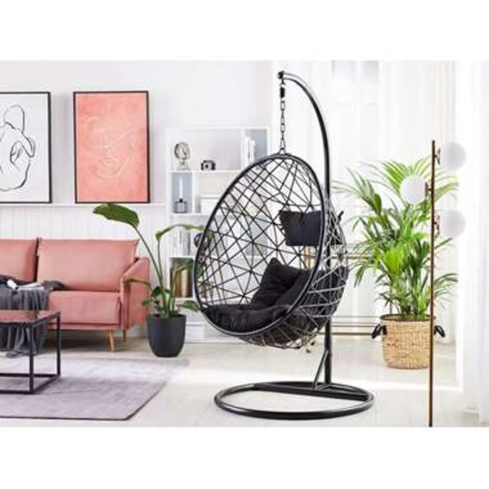 Ronde hangstoel voor binnen en buiten, inclusief kussens. Het opvallende ontwerp van deze hangstoel van robuust polyrotan zorgt voor een romantisch en zorgeloos vakantiegevoel op de veranda of in de slaapkamer. De gevlochten stoel is opgehangen aan een zware metalen ketting, die op zijn beurt is bevestigd aan een zeer stabiel stalen frame. Zo biedt de stoel rustgevende, subtiele schommelingen en laat je zweven op het comfortabele, waterbestendige zitkussen, zoals op een wolk in de lucht.