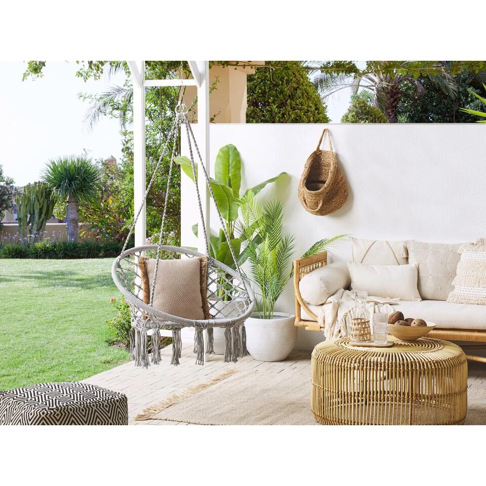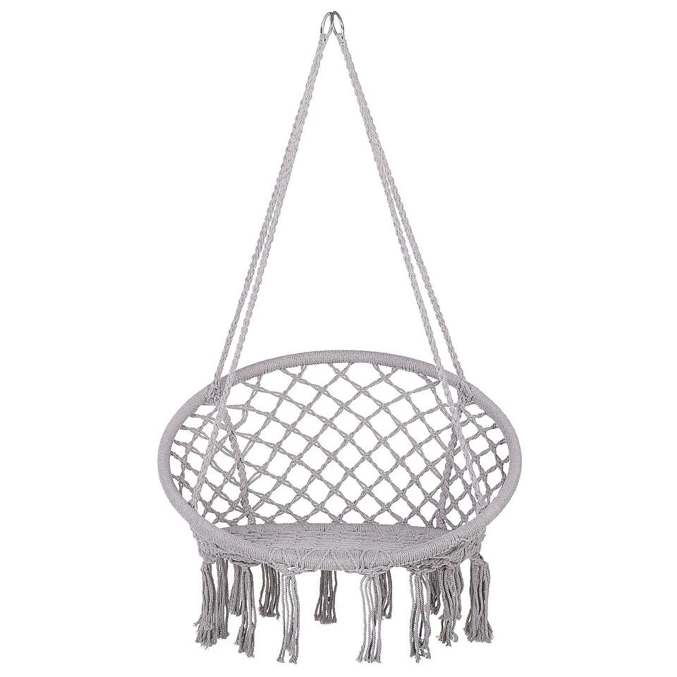 Hangende Macramé Schommelstoel. Met deze hangstoel kom je in een mum van tijd in een echte ontspannen sfeer. Leun achterover en geniet van het delicate schommelen, of het nu in je eigen slaapkamer, woonkamer of balkon is. De stoel heeft een sterk frame met een gevlochten, boho-stijl katoenen macramé zitting die een zorgeloos karakter geeft aan elke kamerindeling. Hang het op een plek naar keuze en creëer een mooie vrijetijdshoek.
