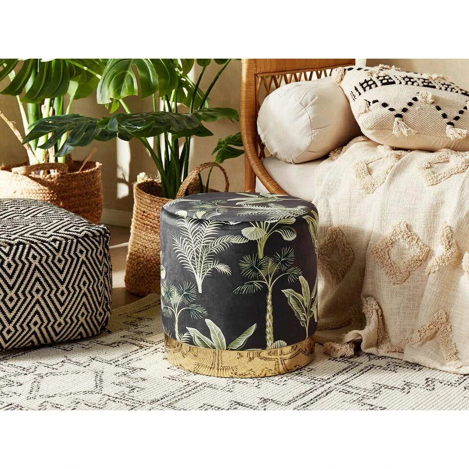 Fluwelen poef met bladpatroon. Deze poef gaat zeker een verschil maken in je woon- of slaapkamer. Hij trekt de aandacht dankzij een bladpatroon in groene kleur en een gouden onderkant. De poef is ook multifunctioneel, zo gebruik je hem als voetenbankje, extra zitplek of als bijzettafeltje in je woonkamer.