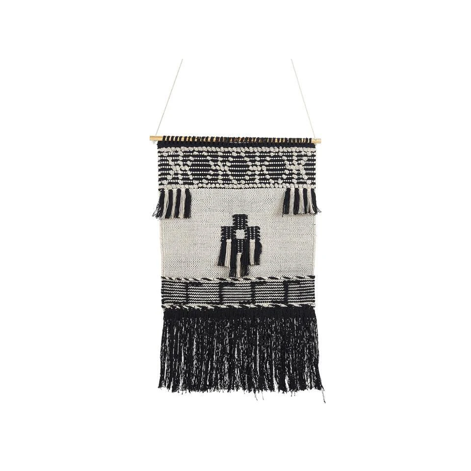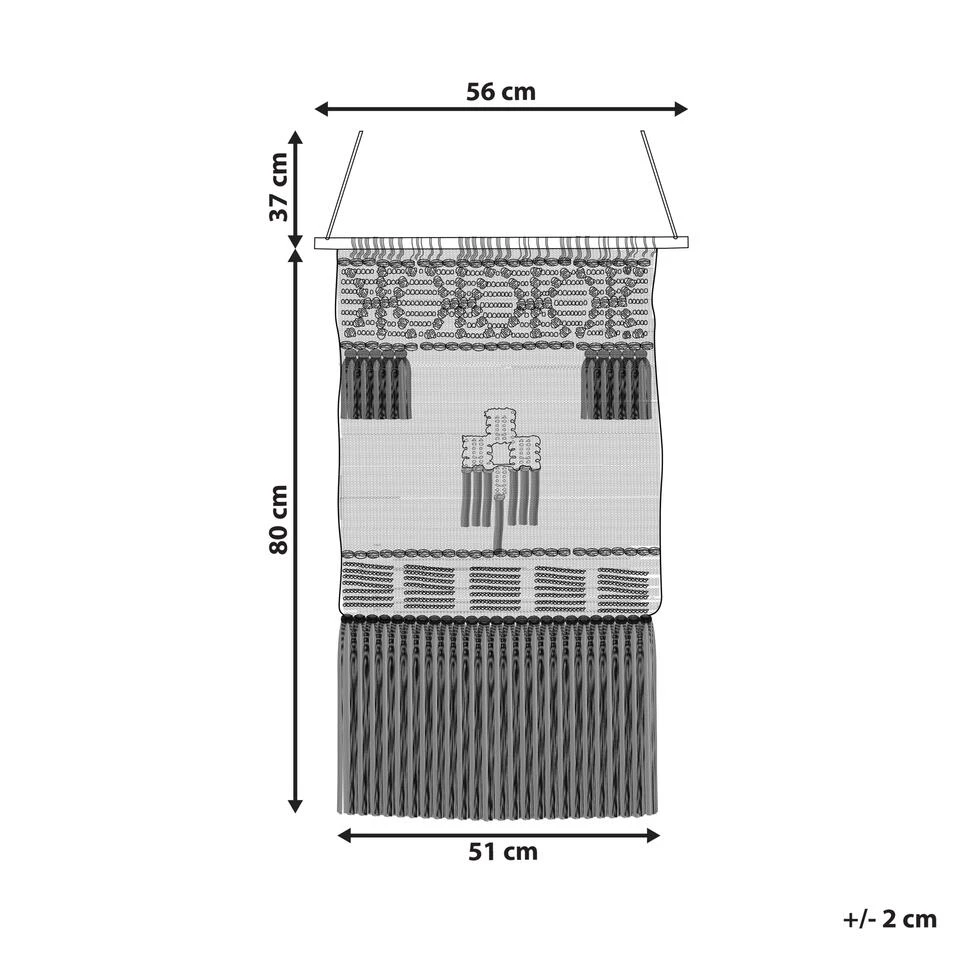 Handgemaakte boho wandhanger met franjes. Creëer een stijlvol en gezellig interieur met deze prachtige wanddecoratie. Gemaakt van duurzaam en hoogwaardig katoen, blijft de decoratie jarenlang mooi. Het beige en zwarte geometrische patroon en de decoratieve franjes maken het ornament tot een unieke blikvanger in elke ruimte.