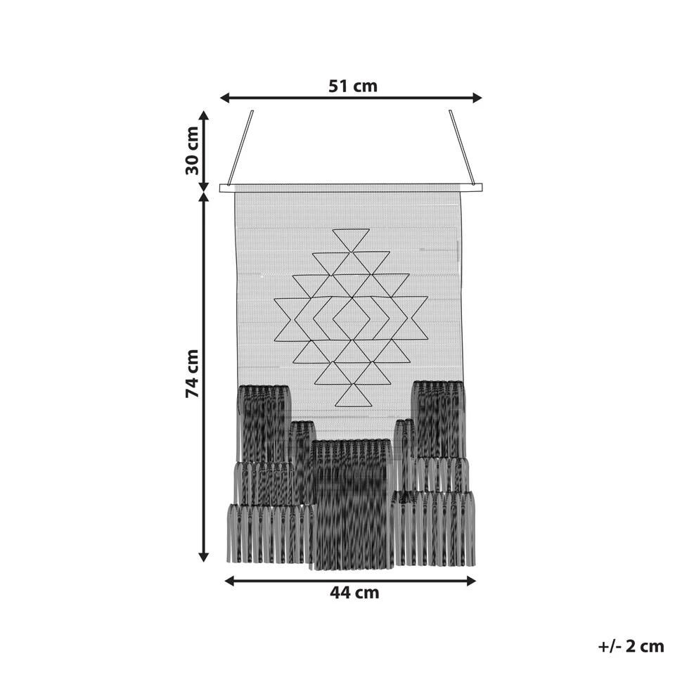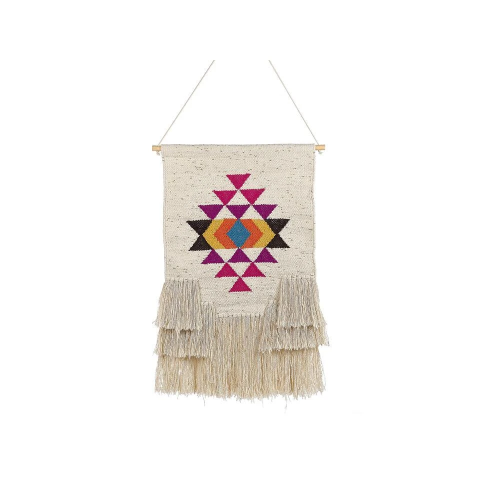 Handgemaakte boho wandhanger met franjes. Deze stijlvolle wanddecoratie brengt een gezellige sfeer in de slaapkamer, woonkamer of kinderkamer. Dankzij het meerkleurige geometrische patroon en de beige franjes brengt de decoratie een vleugje boho-stijl in elk interieur. De wandhanger is met de hand geweven van hoogwaardig katoen voor een unieke uitstraling.