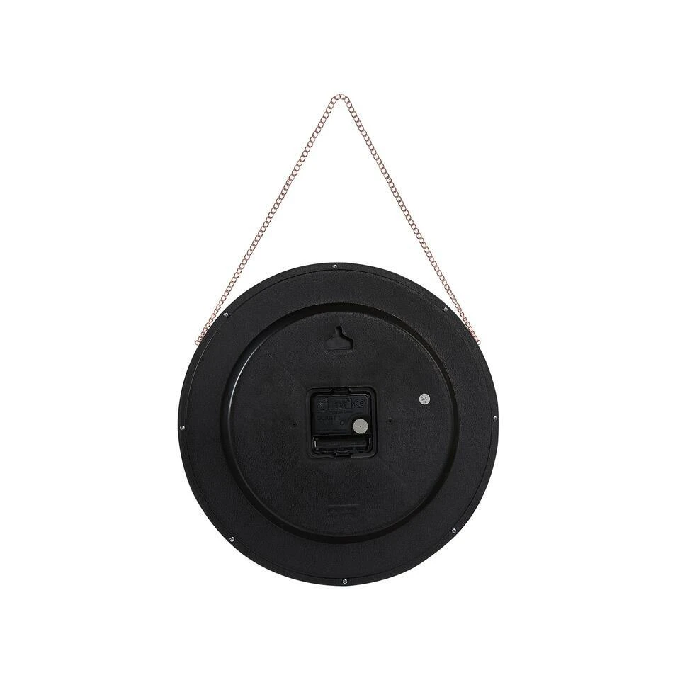Moderne Wandklok. Hang deze klok in je woonkamer of hal om er meteen een nieuwe, moderne sfeer te creëren. Het is verfraaid met een dunne koperkleurige ketting, die perfect past bij de eenvoudige, zwarte wijzerplaat van de klok.