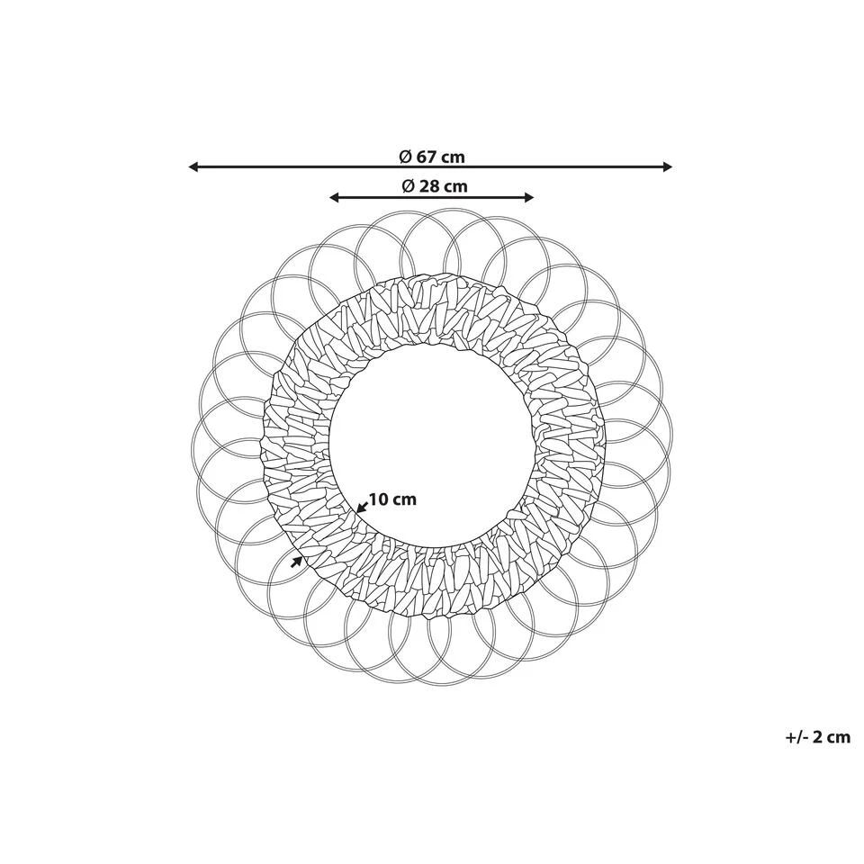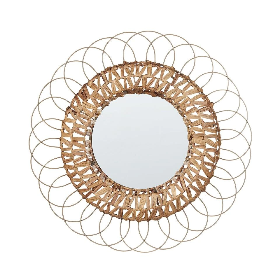 Decoratieve hangende spiegel. Versier elke kamer met stijl met deze functionele hangspiegel. Het originele metalen frame is voorzien van een handgemaakte waterhyacintdecoratie. De combinatie van innovatieve materialen en de hoogwaardige afwerking maken het tot een werkelijk uniek meubelstuk.