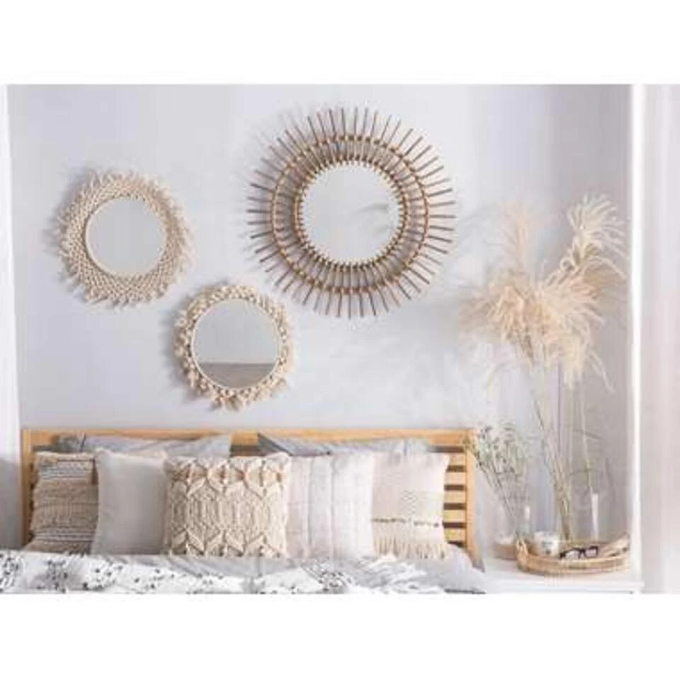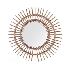 Originele muurspiegel gemaakt van rotan in de vorm van een zon. Breng een beetje excentriciteit in je woning en hang deze rotan spiegel aan de muur van je woonkamer of slaapkamer. De elegante omlijsting in de vorm van een zon heeft een subtiele, zand-beige kleur en geeft je interieur een moderne uitstraling. Dit woonaccessoire is een ideaal, decoratief element dat de aandacht van iedereen trekt.