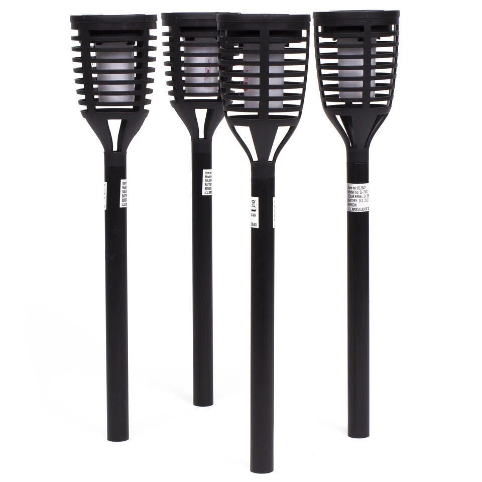 Set van 4x stuks solar tuinfakkels, met vlam effect Led verlichting voor de tuin. De lamp werkt op zonne-energie waardoor het zichzelf oplaadt gedurende de dag. Inclusief grondpin, zodat u ze bijvoorbeeld langs een looppad kunt zetten. Schakelaar: ja. Kleur licht: warm wit, vuureffect. Kleur lamp: zwart. Afmeting: 41 x 10 x 10 cm. Materiaal: kunststof. Tuinlampen/tuinverlichting/prikspots op zonne-energie.