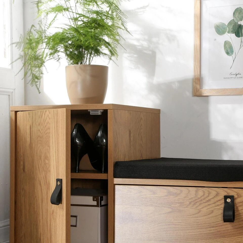 Productkenmerken: Schoenenbank. 1 grote opbergruimte met een deur die naar beneden opent, uitgerust met 2 zuigers en 2 scharnieren. 1 bovenste opbergruimte uitgerust met 1 deur. 2 zwarte handgrepen met imitatieleer. Eikenhouten decor. Zwarte metalen poten. Zwart kussen bovenop. 100% polyester stof. Productafmetingen: Breedte 38 cm x Lengte 100 cm x Hoogte 58 cm – Nettogewicht: 19,6 kg. Verpakkingsafmetingen: Breedte 44 cm x Lengte 106,5 cm x Hoogte 18 cm – Nettogewicht: 21,1 kg.