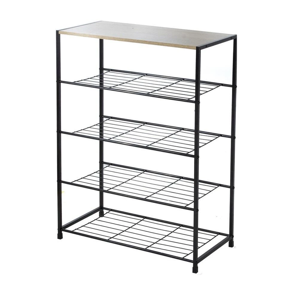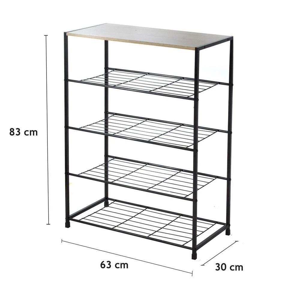 Dit schoenenrek is gemaakt van zwart metaal en heeft 5 niveaus. Dit zwarte metalen schoenenrek met 5 etages biedt 5 opslagniveaus, met 4 zwarte metalen roosters die zorgen voor duurzaamheid en weerstand. De plank is ook gemaakt van spaanplaat waarop u kleine decoratieve elementen kunt aanbrengen, zoals bijvoorbeeld een sleutelhanger. Deze plank is zowel trendy als modern en is een decoratief element op zich. Materiaal: spaanplaat/metaal. Afmetingen : B63 cm x D30 cm x H83CM. Gewicht : 4,8 kg