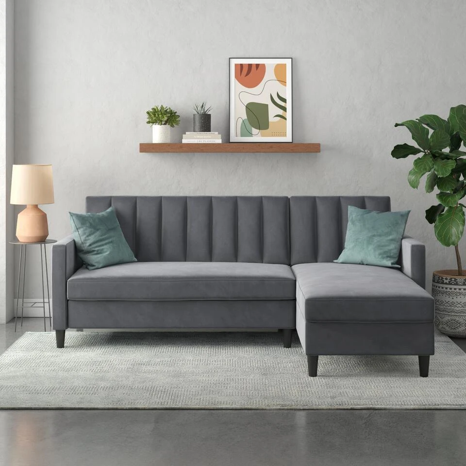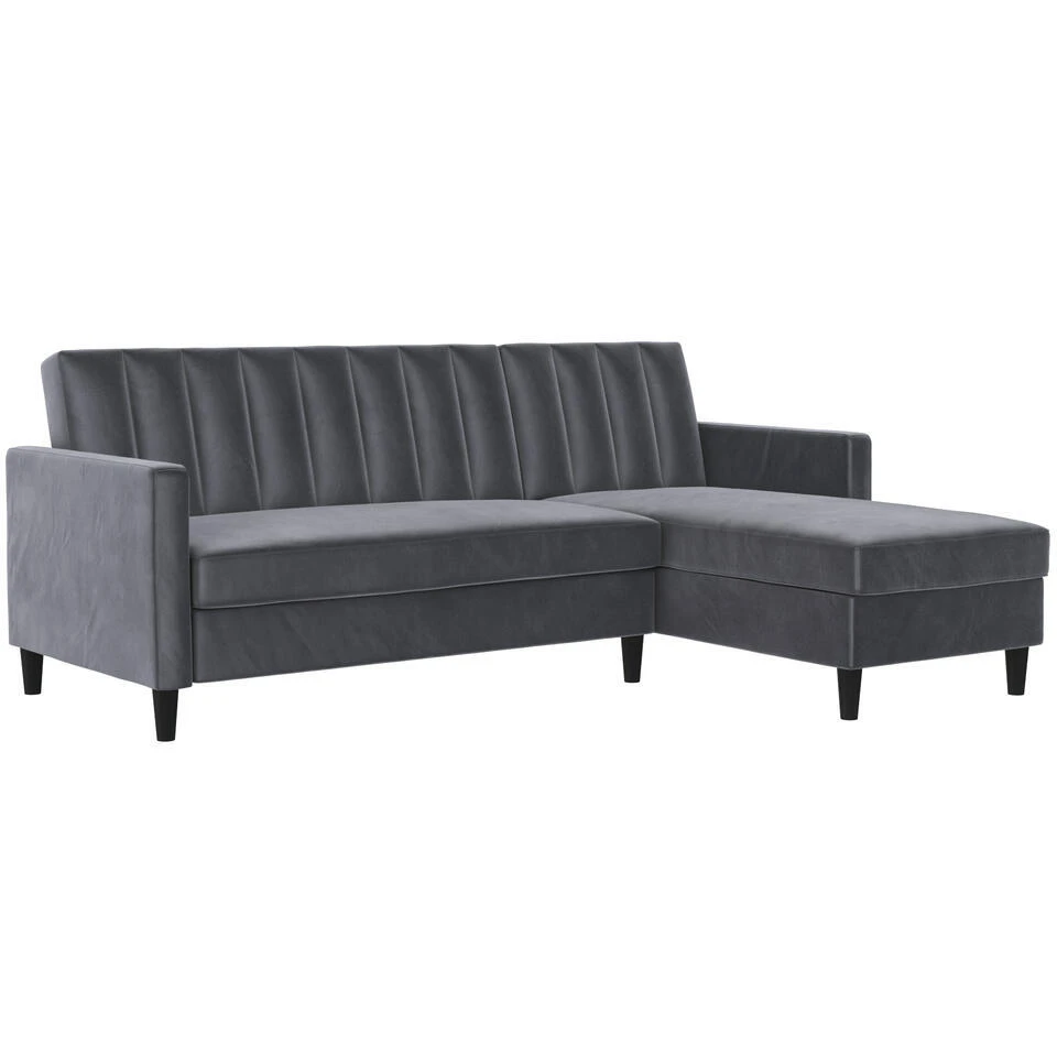 Deze slaapbank heeft een moderne stijl. Het is gemaakt van gefabriceerd hout en een fluwelen hoes. De vulling is gevuld met schuim voor optimaal comfort. De hoekbank heeft een uitbreidbaar slaapoppervlak en kan als logeerbed worden gebruikt. Het is handmatig verstelbaar. De chaise longue kan worden geopend voor opslag.
