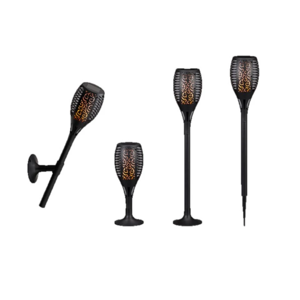 Solar tuinlamp/tuinfakkel met vlameffect Led verlichting voor de tuin. De lamp werkt op zonne-energie waardoor het zichzelf oplaadt gedurende de dag. Inclusief voet met twee standen, muurbevestiging en grondpin, zodat u ze bijvoorbeeld langs een looppad kunt zetten. Schakelaar: ja. Kleur licht: warm wit, vuureffect. Kleur lamp: zwart. Afmeting: 58 x 10 x 10 cm. Materiaal: kunststof. Inclusief batterijen. Tuinlampen/tuinverlichting/prikspots op zonne-energie.