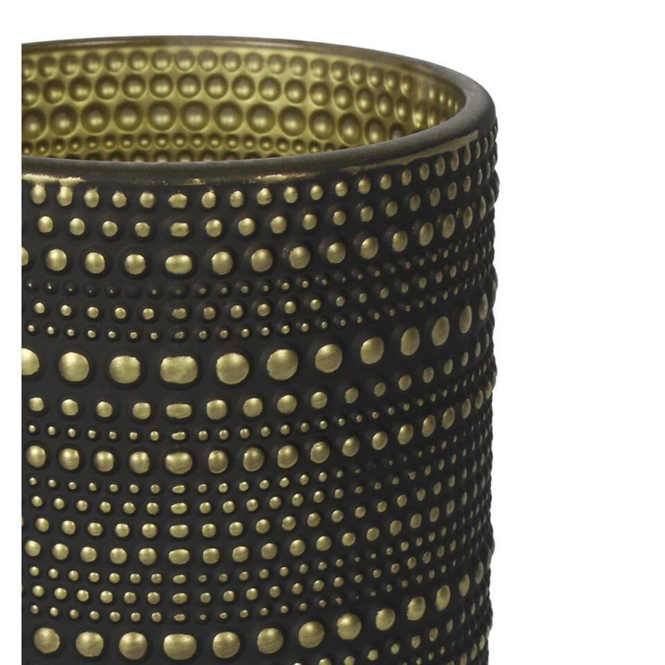 Luxe theelichthouder of kaarsenhouder voor waxinelichtjes van licht doorschijnend relief glas in de kleuren zwart/goud. Afmetingen: D10 x H12 cm. Plaats meerdere formaten en of meerdere stuks van deze serie bij elkaar op een kaarsenbord voor een maximale en stijlvolle sfeer. Serie: Aurora.