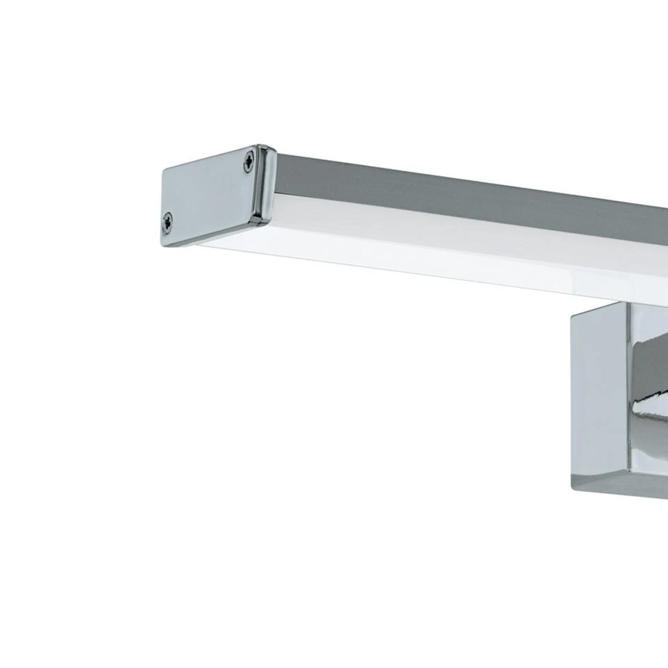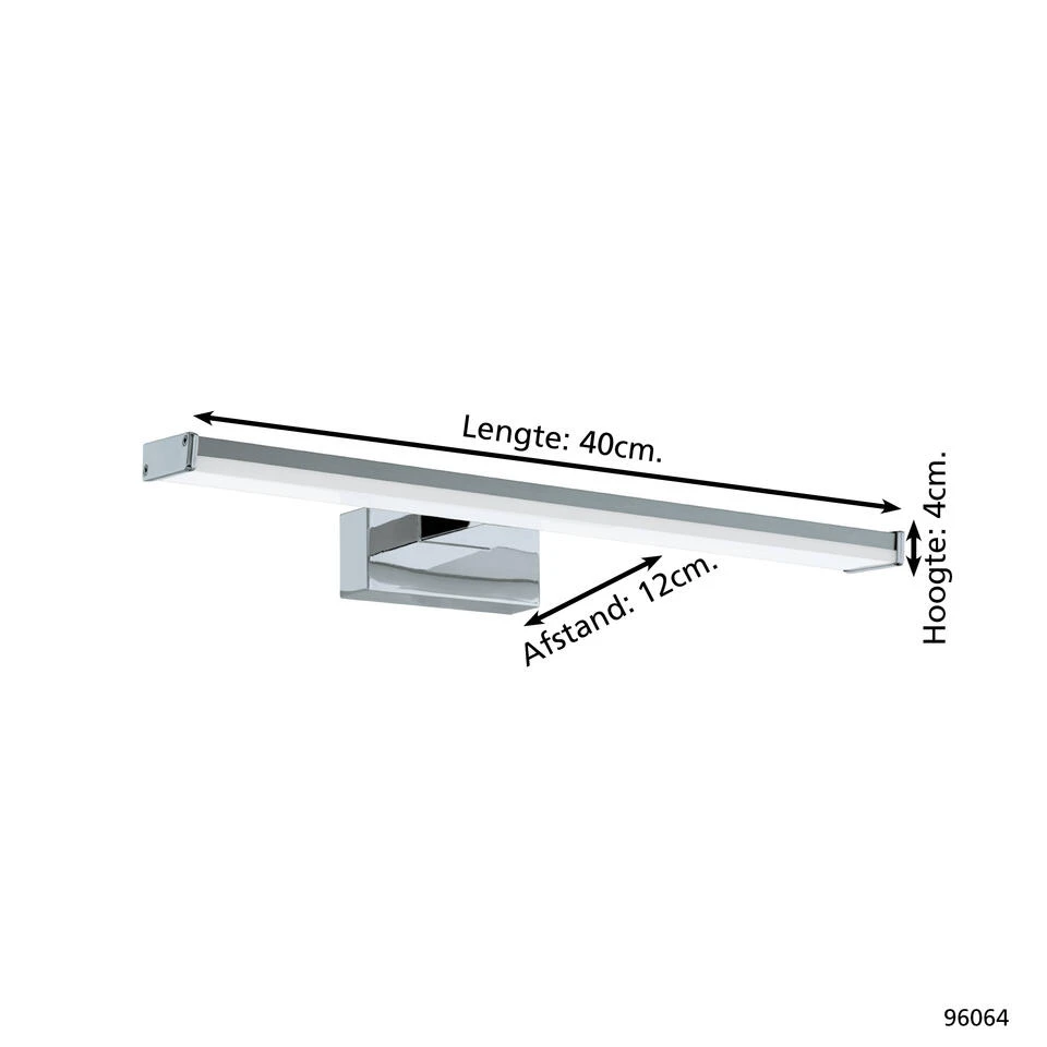 De EGLO Pandella 1 is een spiegellamp gemaakt van staal en kunststof details. De strakke spiegellamp met een lengte van 40cm heeft een chromen afwerking. Deze lamp heeft een energiezuinige geïntegreerde LED module met een wattage van 7,4W. De Pandella 1 geeft een helder en neutraal wit licht. Deze lamp is spatwaterdicht (IP44) en is hierdoor toepasbaar in de badkamer (zone 2 of 3). De lamp is speciaal ontworpen voor gebruik in de badkamer maar is natuurlijk ook in andere woon- en/of werkruimten toepasbaar.