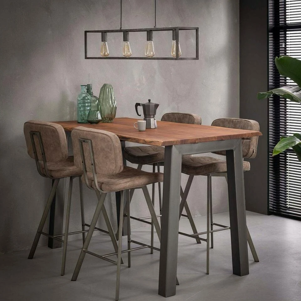Transformeer uw eetkamer of woonkeuken met deze moderne en stoere bartafel Elias met een afmeting van 147×80 cm! Deze tafel valt op dankzij zijn tafelblad, dat gemaakt is van stevig acaciahout met een dikte van 25 mm en heeft een gave boomstamvorm. Om dit tafelblad helemaal af te maken is hij blank afgelakt, wat bescherming biedt tegen vocht en vuil. Het onderstel bestaat uit twee grijze poten die gemaakt zijn van gepoedercoat staal met een dikte van 6 cm. Elias is ook verkrijgbaar als eetkamertafel met een breedte van 180, 210 of 240 cm.