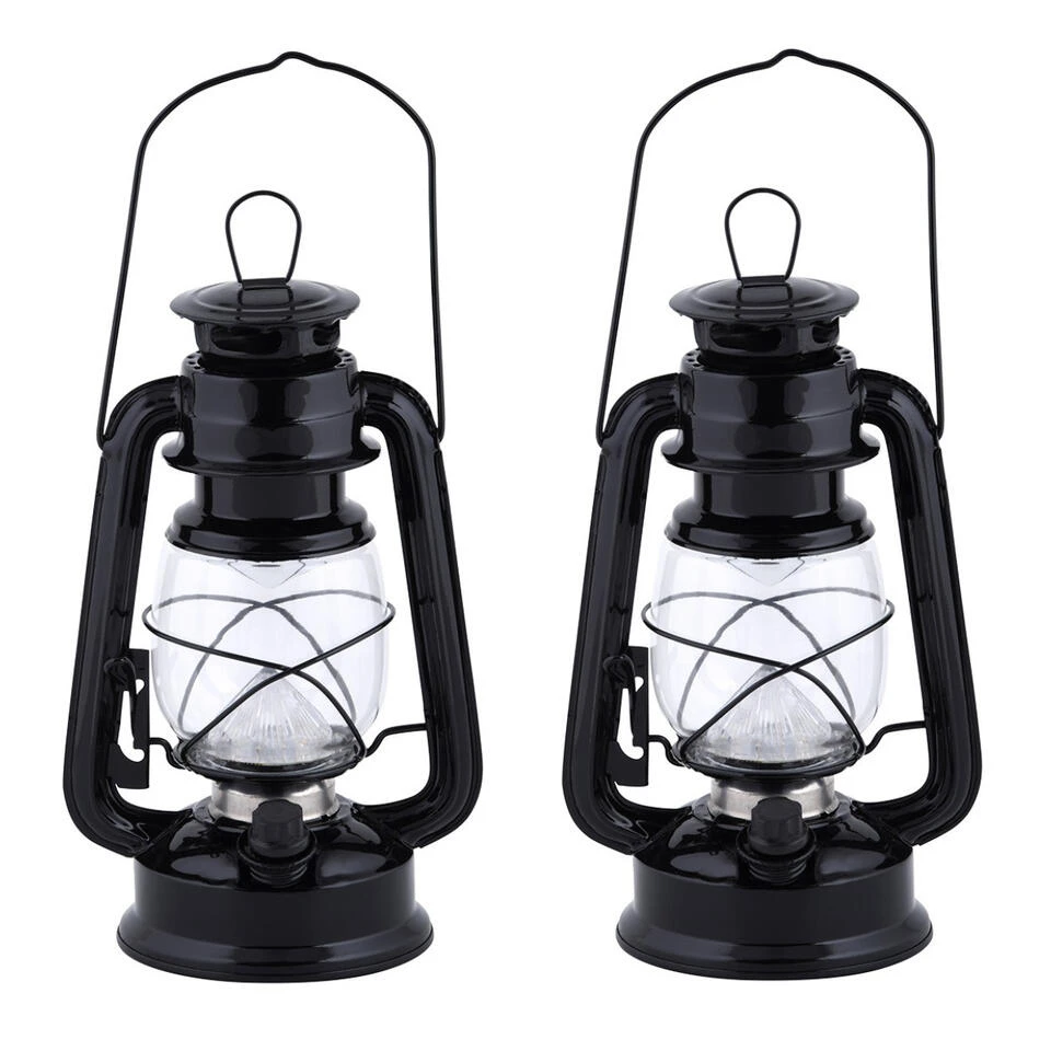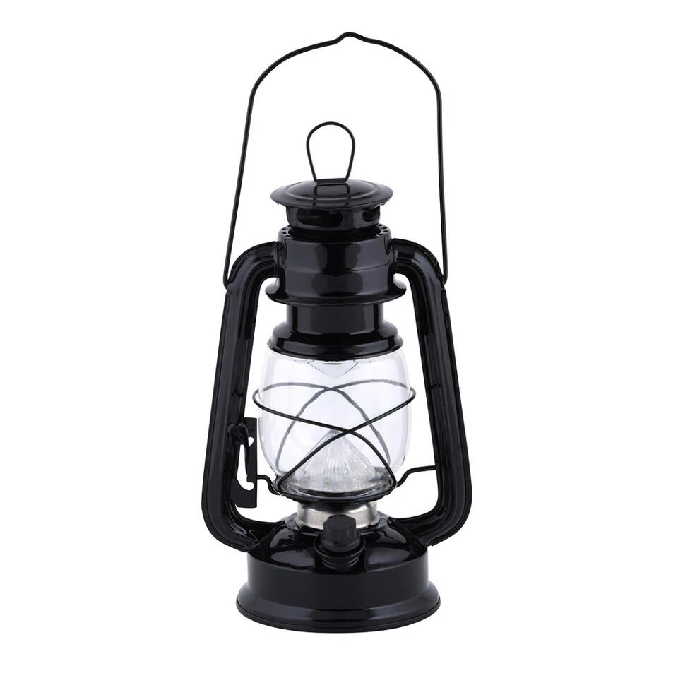 LED stormlantaarn/windlicht zwart op batterijen. Sfeervolle LED lantaarn met ouderwetse olielamp uitstraling. Aan de bovenzijde zit een hang oog van circa 3 cm om de lantaarn makkelijk op te hangen. Formaat: 11,5 x 15 x 24,1 cm. Totale hoogte met hengsel is 39 cm. Materiaal: ijzer, glas. De lichtbron is instelbaar door te draaien aan het wieltje dat meer of minder sfeerlicht geeft. Werkt op 4x AA batterijen welke niet zijn inbegrepen.