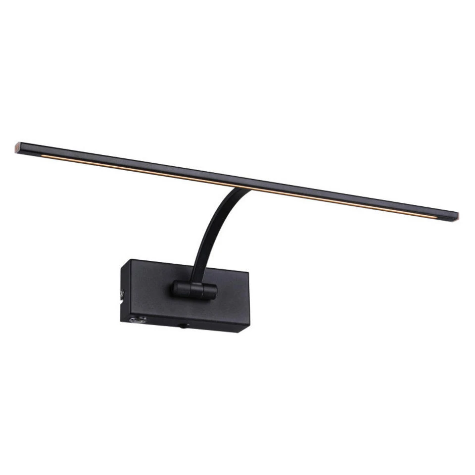 Dit armatuur is voorzien van een ingebouwde LED strip en deze strip verbruikt 8 watt en geeft 650 lumen aan warm-wit licht (2700 Kelvin).Het horizontale profiel is te kantelen (er bevindt zich een scharnier punt aan de wandplaat) waardoor deze goed te richten is op het schilderij of op de spiegel. De wandplaat is 6 cm hoog en 13,5 cm breed, de totale diepte is 20,5 cm en de lengte van het LED profiel is 45,5 cm. Kleur: mat zwart.