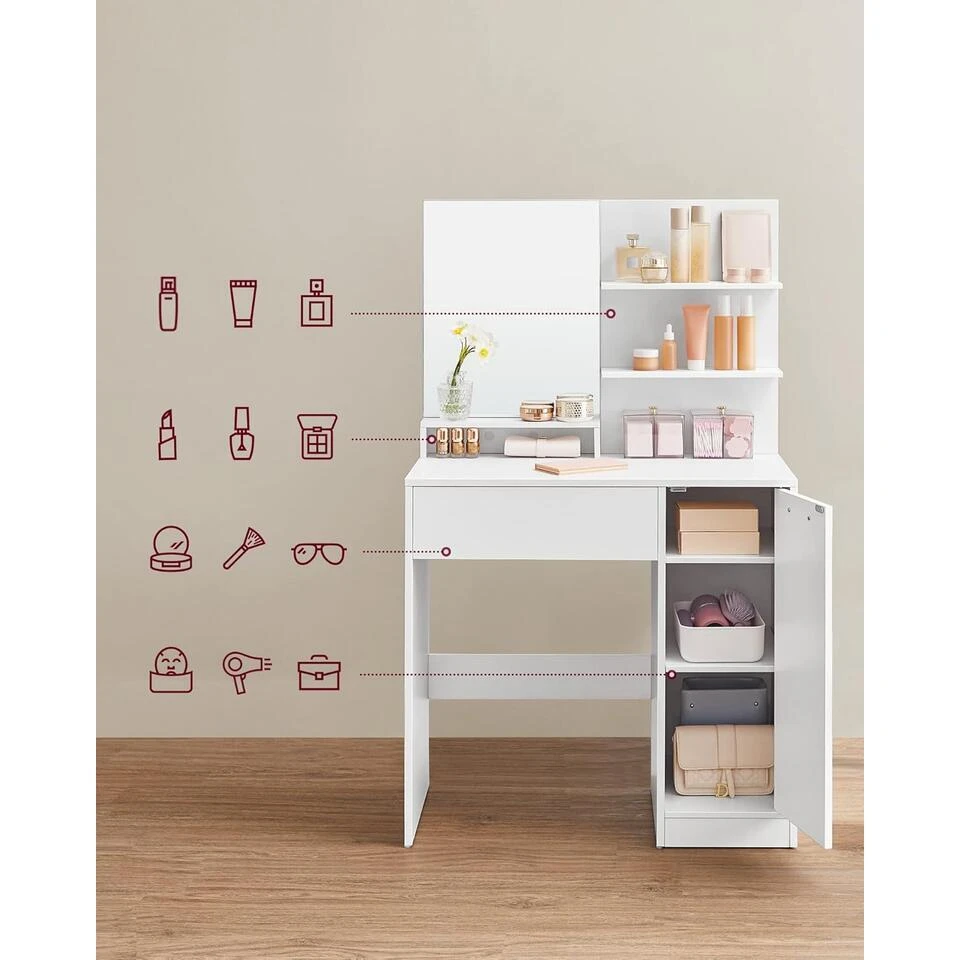 Geef je geliefde een verrassing: een strak, glanzend uiterlijk, het strakke witte tafelblad met frameloze spiegel en de serene stijl die je interieur compleet maakt. Je geliefde zal geen seconde missen om te gaan zitten en zich klaar te maken met je cadeau