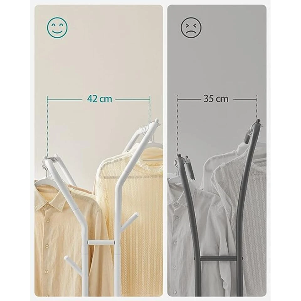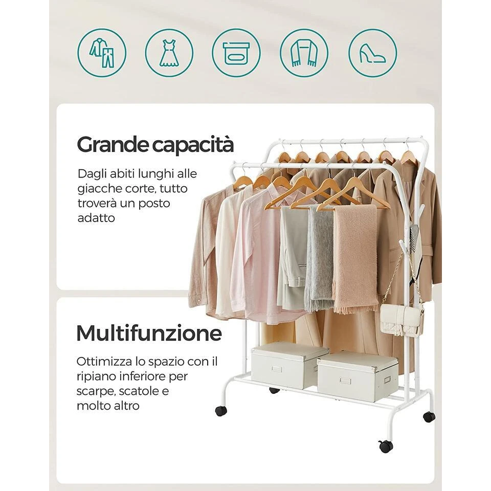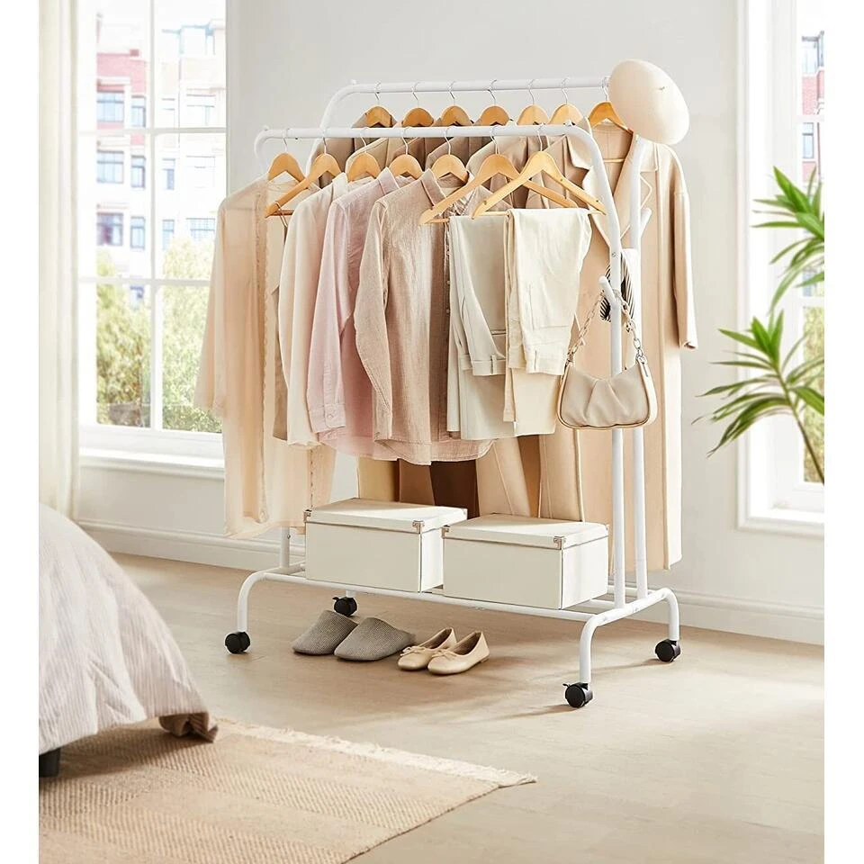 [Veelzijdige opslag] Met een hoge rail en een lage rail voor het ophangen van kleding van verschillende lengtes, haken aan beide zijden voor tassen en hoeden, en een onderste plank voor dozen en schoenen, houdt dit kledingrek al je benodigdheden op één plek [Sneldrogend en gemakkelijk toegankelijk] De afstand van 42 cm tussen 2 kledingophangrails zorgt ervoor dat de lucht gemakkelijk doorstroomt, wat een snelle droging bevordert. Het biedt voldoende ophangruimte om overvolle, rommelige kleding te voorkomen, waardoor ze gemakkelijker toegankelijk zijn [Gemakkelijk te verplaatsen en te vergrendelen] Schuif de dubbele kledingroede moeiteloos naar elke kamer in huis dankzij de 4 zwenkwielen. 2 van de wielen zijn vergrendelbaar, waardoor je het rek ook op één plek kunt bewaren [Stabiel en sterk] Met bouten die de 25,4 mm dikke stalen buizen bevestigen, heeft dit kledingrek een stabiel frame dat tot 100 kg kan dragen. Elke rail heeft een max. statisch draagvermogen van 30 kg; elke haak tot 5 kg; en de onderste plank kan maximaal 20 kg dragen [Eenvoudige montage] De eenvoudige structuur, de genummerde onderdelen en de geïllustreerde, gemakkelijk leesbare instructies maken het opzetten van dit robuuste kledingrek een fluitje van een cent.