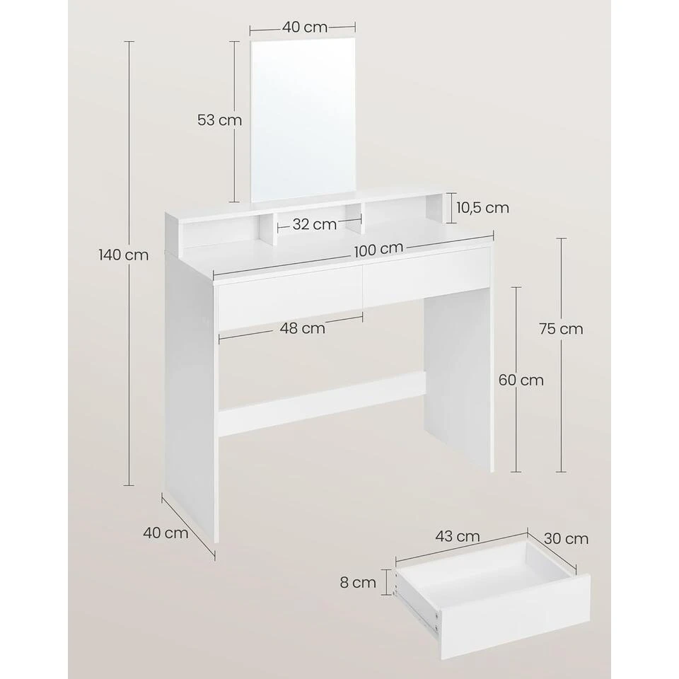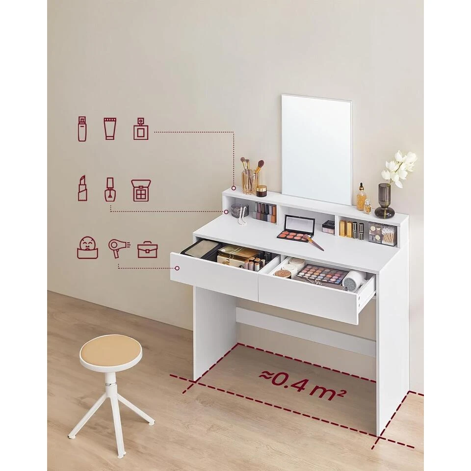 - WAT KRIJG JE? Een kaptafel met 2 lades, 3 open vakken en een grote spiegel waar je jezelf elke dag kunt bewonderen. U krijgt ook een anti-tipper en een geweldige manier om uzelf op een ontspannen manier te kleden.