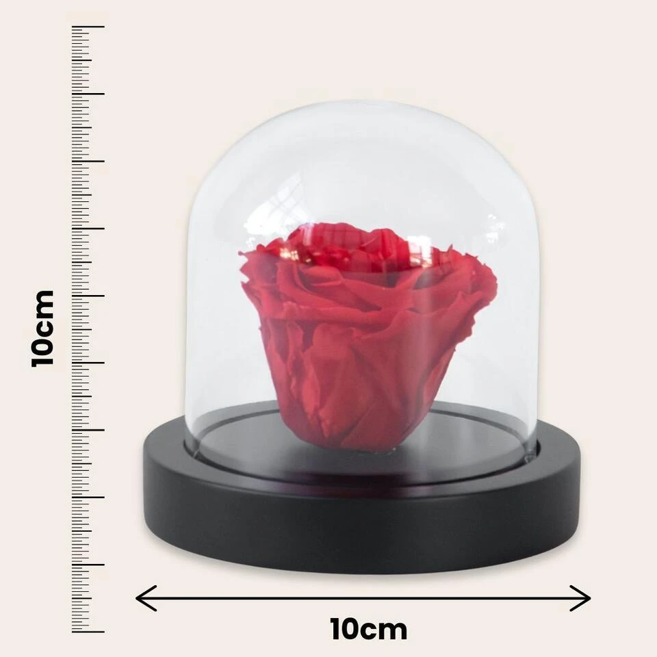 De roos wordt verpakt in een stijlvolle glazen stolp van 10cm.