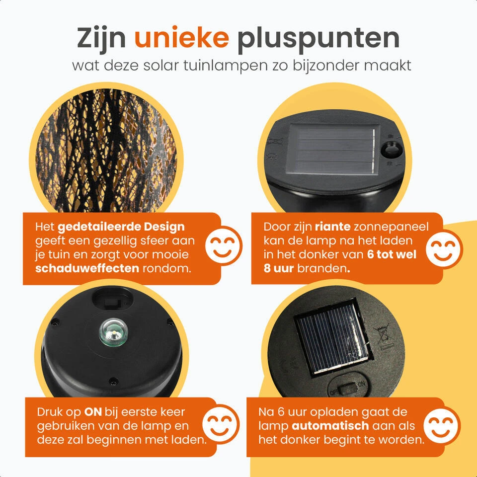 De unieke schaduweffecten die door het metalen ontwerp worden gecreëerd, zorgen voor een prachtig lichtspel op je terras of in de tuin. Dit voegt een artistiek element toe aan je buitenverlichting en maakt elke avond speciaal.