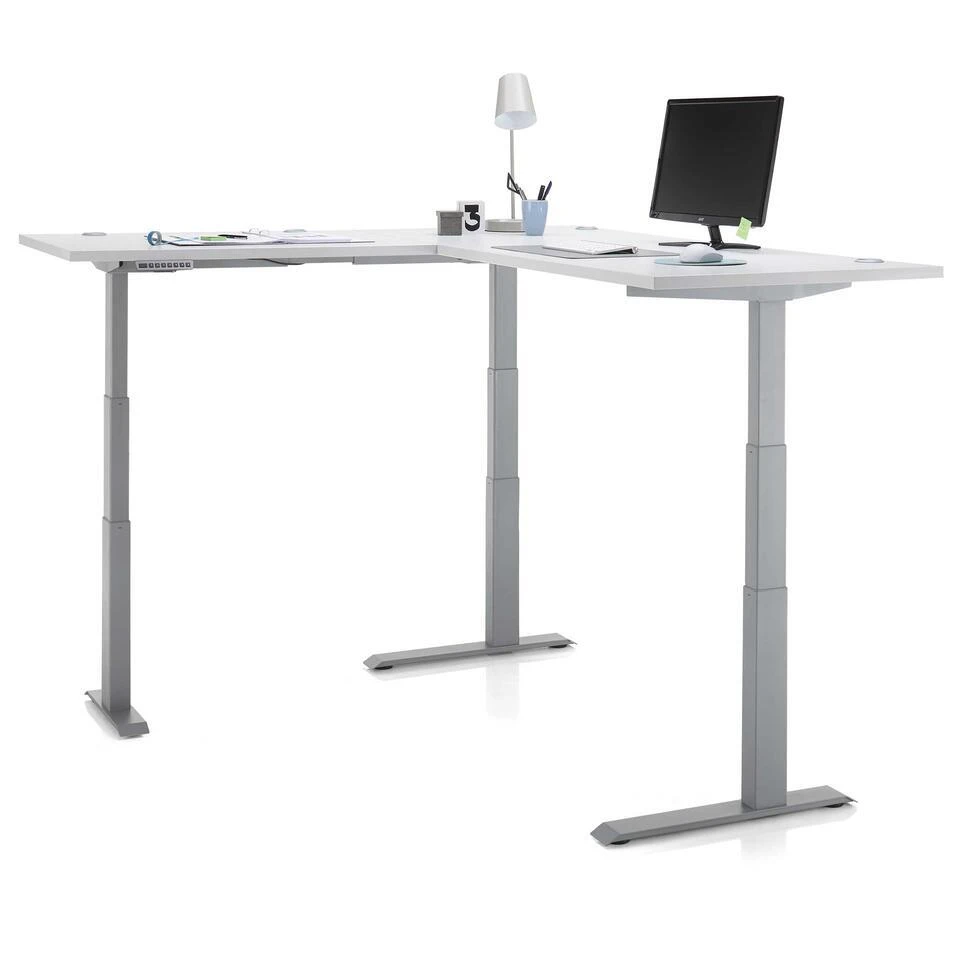 Maak van je werkplaats een ergonomisch paleis met een praktisch zit-stabureau van de Cino-collectie. Het lichtgrijze tafelblad van dit hoekbureau rust op een grijze voet die gemaakt is uit gepoedercoat staal. De afmetingen van de twee delen van het bureau zijn 185 op 77 cm en 177 op 67 cm. Je kan de tafel elektrisch verstellen in hoogte (64-129 cm) dankzij het digitale display. Naast de omhoog- en omlaagknop, zijn er vier knopjes met geheugenfunctie waarmee je bepaalde hoogtes kan opslaan. Daarnaast is het tafelblad voorzien van meerdere kabeldoorvoeringen. Netjes en praktisch!Â