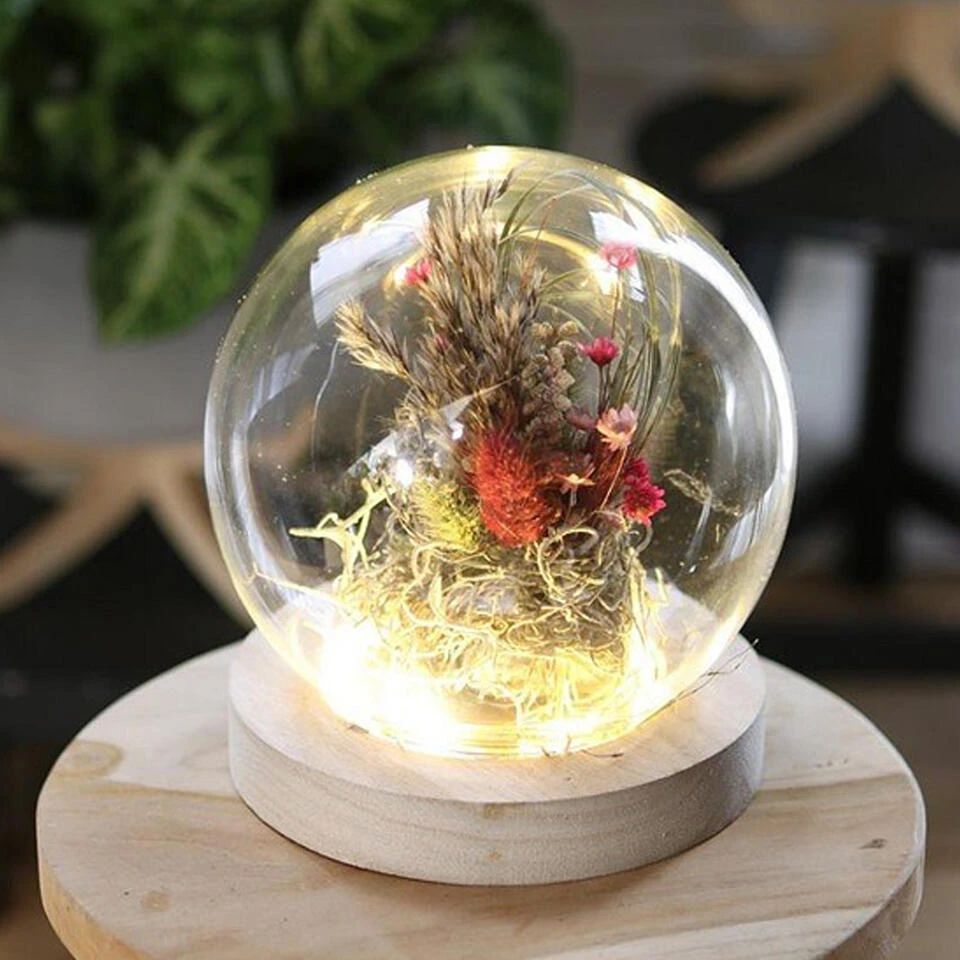 Decoratie stolp van helder glas op een houten plateau met LED verlichting. Presenteer de mooiste snuisterijen onder deze transparante stolp. Afmetingen: ca. Diameter plateau 13 cm x Hoogte inclusief plateau 13 cm. Let op, de diameter van de plateau is altijd iets breder dan de stolp in verband met de uitstekende rand. Materiaal: glas en hout. Home Deco stolpen/woonaccessoires.