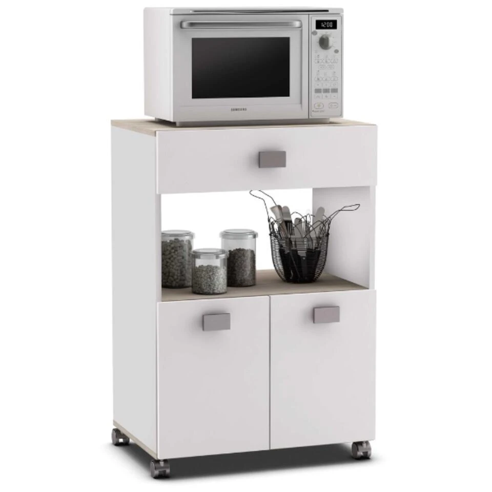 Deze neutrale keukentrolley heeft een speels kantje door zijn rechthoekige handgrepen. Het beschikt over een lade voor uw bestek en 2 draaideuren met daarachter ruimte voor potten en pannen, borden, glazen of voorraad. In het open vak is nog plaats voor kruiden en olijfolie of keukengerei. Op het werkblad kunt u een microgolfoven plaatsen. Het kastje kan gemakkelijk verplaatst worden naar gelijk welke plek waar u het nodig heeft door de handige wieltjes onderaan.Â