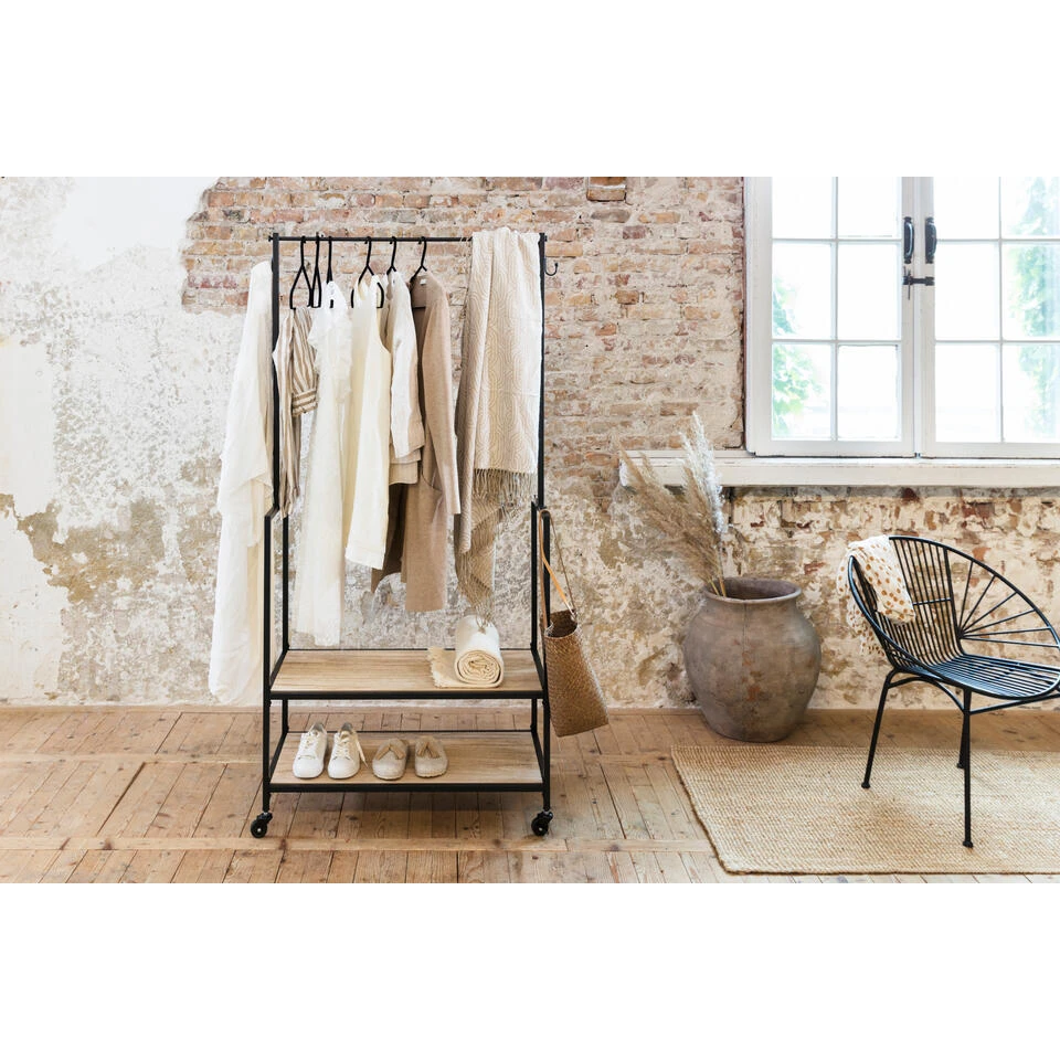 Industrieel kledingrek details: materiaal: MDF en metaal; hoogte kledingrek: 173 cm: afmetingen planken: 42.5 x 84 cm; maximaal hanggewicht: 15 kg; maximaal draaggewicht (per plank): 35 kg.