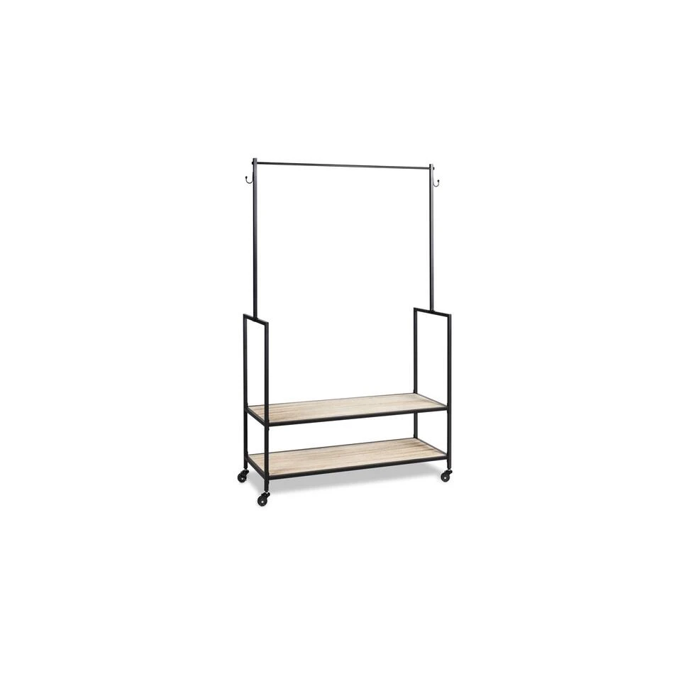 Metaal en houten kleding- en schoenenrek: dit rek heeft een stevige metalen constructie en is voorzien van 2 houten planken. Hierdoor kun je een lange tijd genieten van dit kledingrek! Het garderoberek heeft 4 wielen, waardoor het rek makkelijk te verplaatsen is. De wielen hebben ook remmen, hierdoor zal het kledingrek altijd stevig op de grond