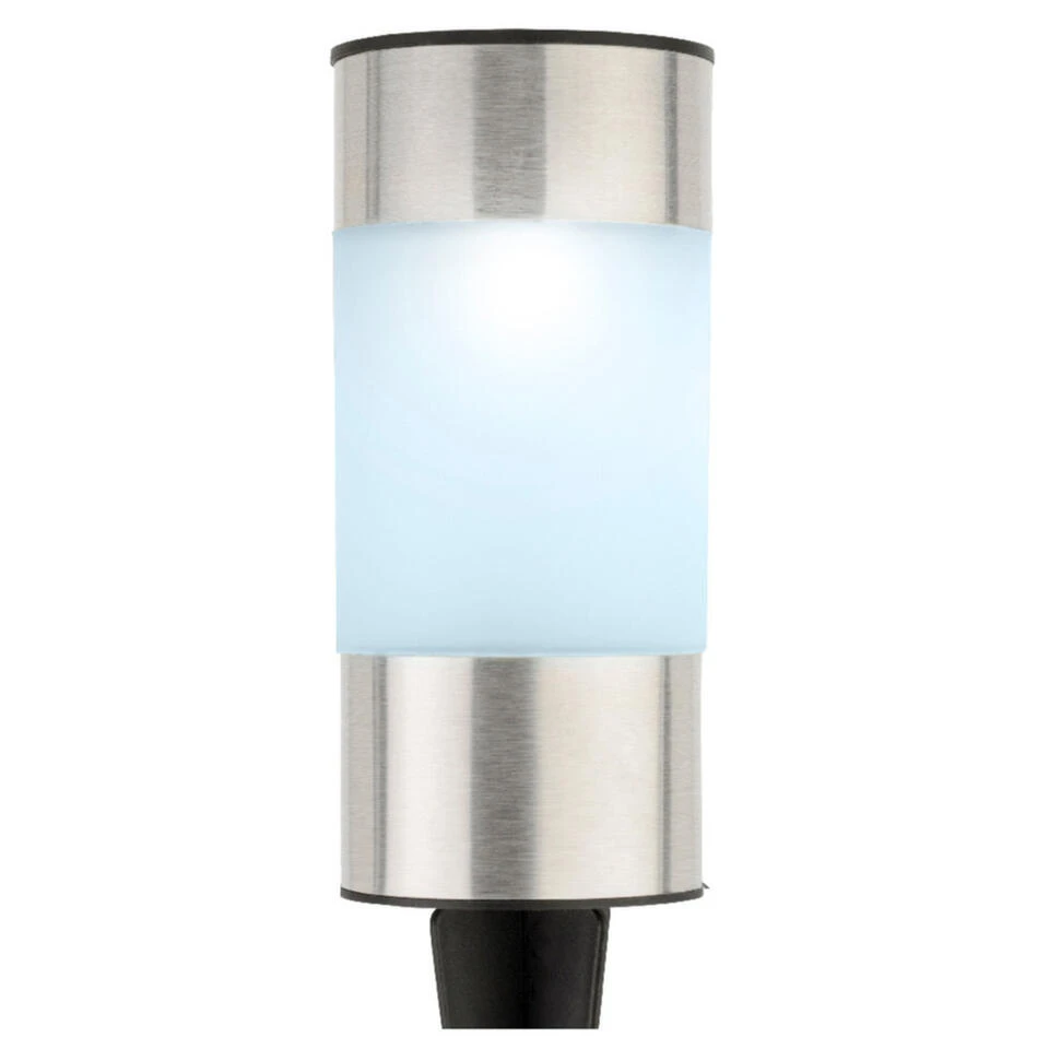 Solar tuinlamp cilinder, met LED verlichting voor de tuin. De lamp werkt op zonne-energie waardoor het zichzelf oplaadt gedurende de dag. Inclusief grondpin, zodat u ze bijvoorbeeld langs een looppad kunt zetten. Schakelaar: ja. Kleur licht: koel wit. Kleur lamp: zilver. Afmeting: 6.3 x 14 cm. Materiaal: RVS. Inclusief vervangbare batterijen. Tuinlampen/tuinverlichting/prikspots op zonne-energie.