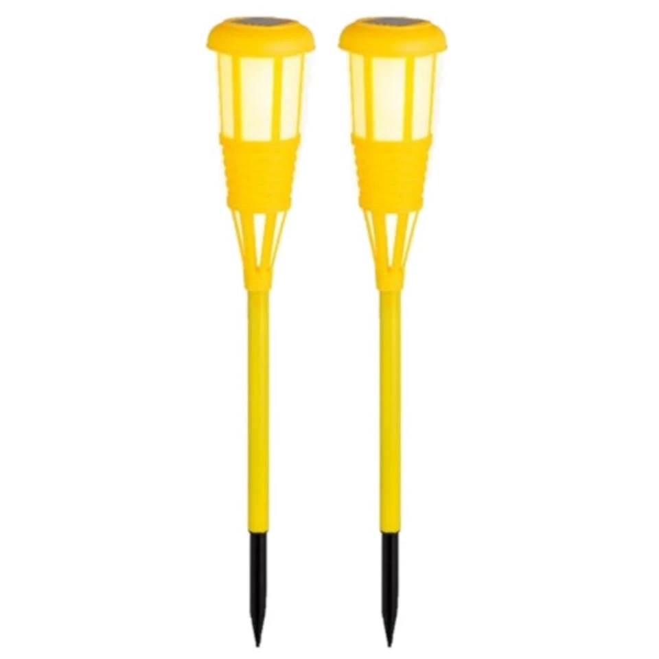Solar tuinlamp/fakkel geel, met Led verlichting voor de tuin. De lamp werkt op zonne-energie waardoor het zichzelf oplaadt gedurende de dag. Inclusief grondpin, zodat u ze bijvoorbeeld langs een looppad kunt zetten. Schakelaar: ja. Kleur licht: warm wit. Kleur fakkel: geel. Afmeting: 10 x 61 cm. Inclusief vervangbare batterijen. Tuinlampen/tuinverlichting/prikspots op zonne-energie.
