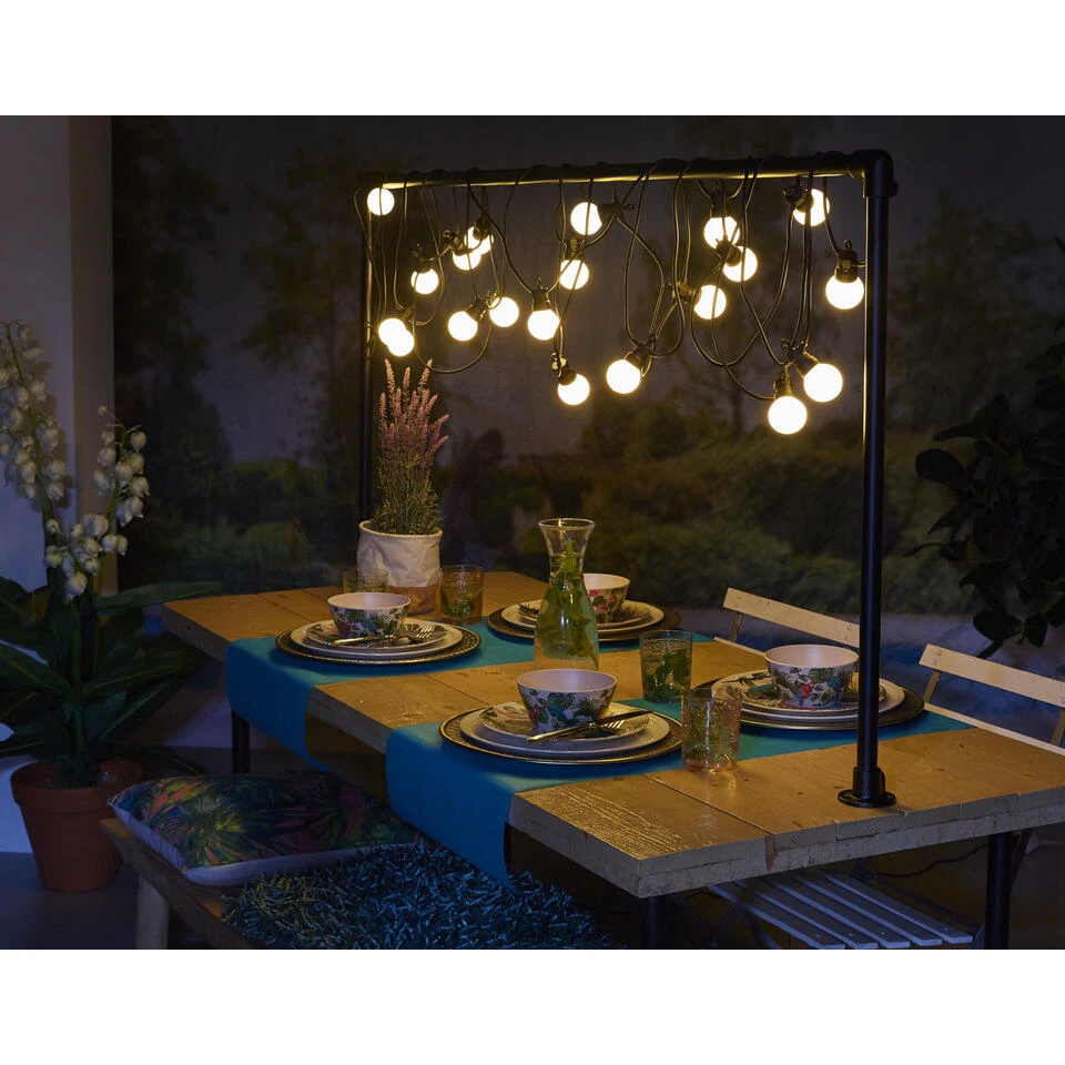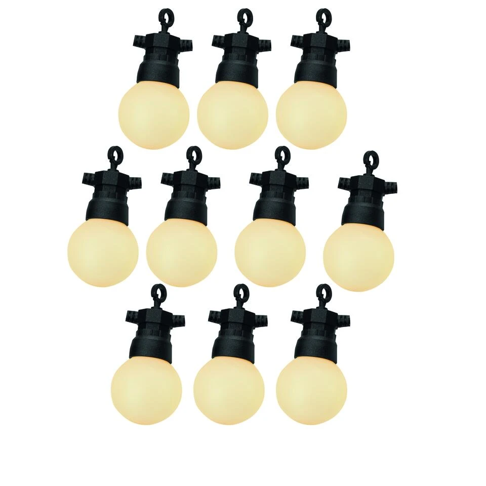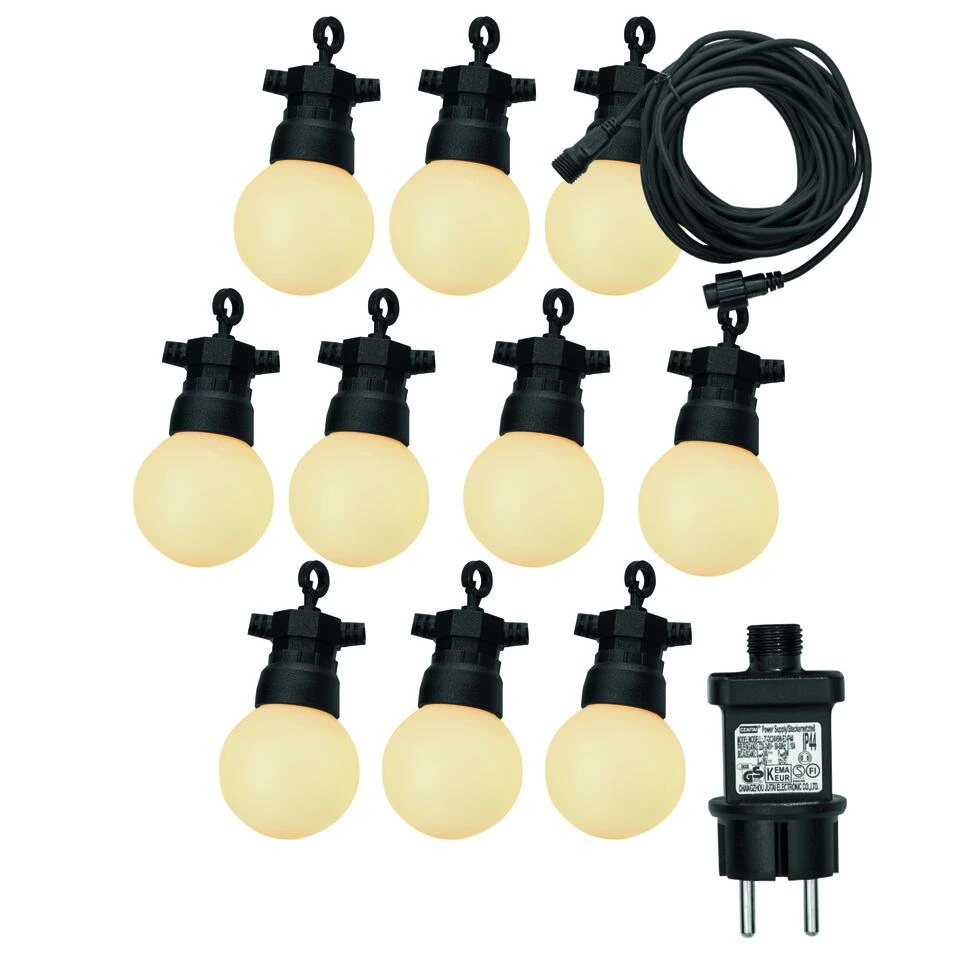 • Vast. Deze feestverlichting heeft een totale lengte van 7,5 meter (4,5 meter voor de 10 lampen welke op een afstand van 50 cm van elkaar af zitten, en nog eens 3 meter van de schakelaar naar de stekker) en is uitgerust met een 3,6 W 24V-transformator. Door de IP waarde (IP-44) kan deze feestverlichting zowel binnen als buiten opgehangen worden. Deze set heeft een lichtopbrengst van 10 lumen en beschikt over de energieklasse A ++. Info Laagvoltage Verlichting: