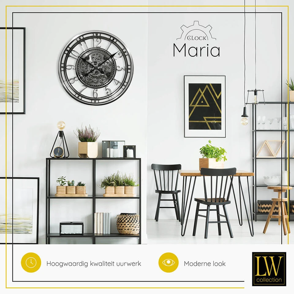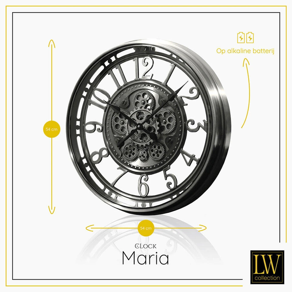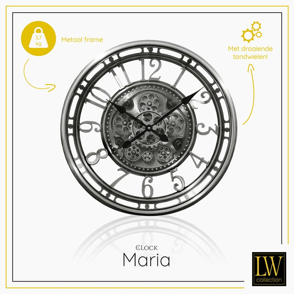 Bent u op zoek naar een luxe radar wandklok die uw woonkamer, slaapkamer of andere ruimte in huis compleet maakt? U kunt uw zoektocht staken! LW Collection biedt een breed assortiment aan wandklokken met draaiende tandwielen voor diverse interieurstijlen. Zo ook deze prachtige klok met een afmeting van maar liefst 54cm uit de serie MARIA.