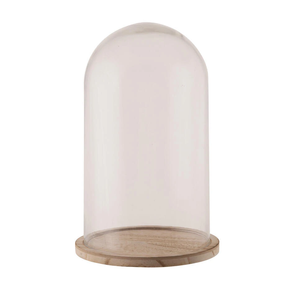 Glazen decoratie stolp op houten plateau met afmetingen 18 x 28 cm. Decoratieve glazen stolp van helder glas met afgeronde bovenkant op een houten plateau. Presenteer uw mooiste snuisterijen onder deze transparante stolp. Diameter plateau: 18 cm. Hoogte inclusief plateau: 28 cm. Let op, de diameter van de plateau is altijd iets breder dan de stolp in verband met de uitstekende rand. Materiaal: glas, hout. Kleur: transparant.