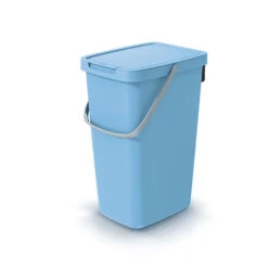 Sorteer of GFT afval scheiden prullenbak of afval emmer voor in de keuken of op/naast het aanrecht. Voorzien van afsluitbare deksel en hengsel. Ruim compartiment van 20 Liter. Kleur: lichtblauw. Afmetingen: 23 x 29 x 45 cm. Op te hangen met bijleverde beugel.