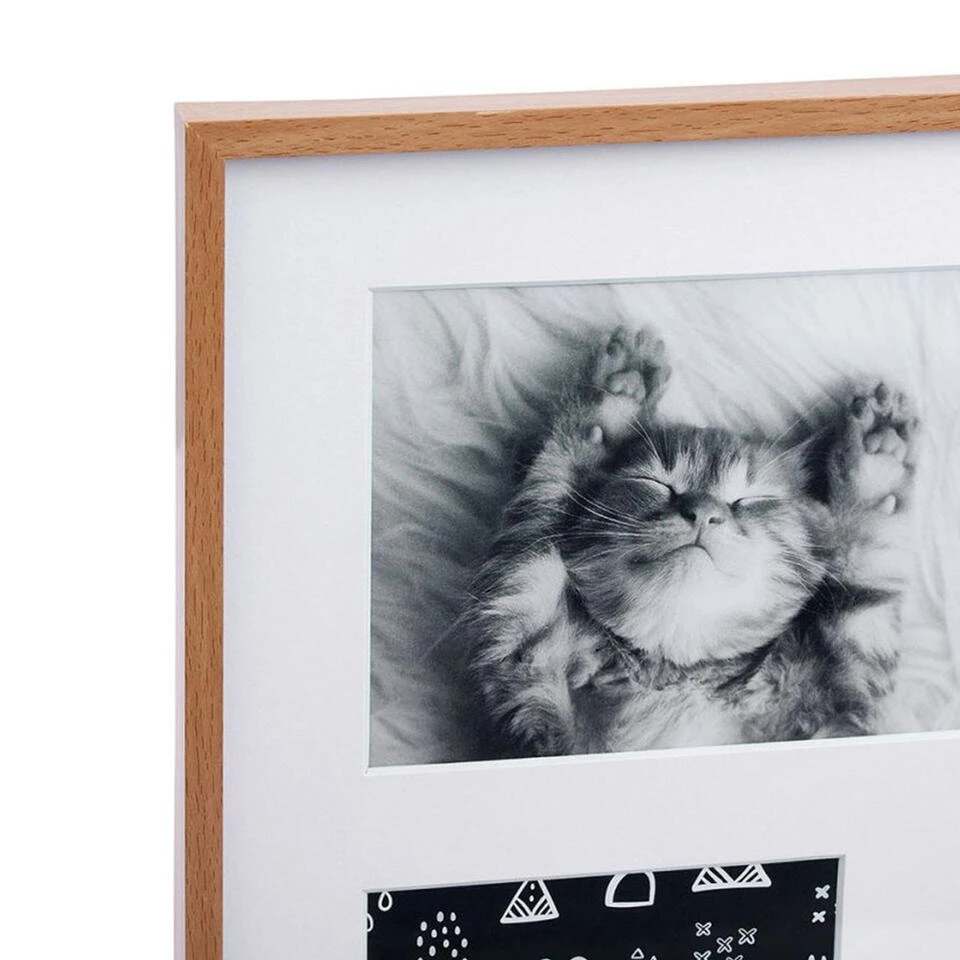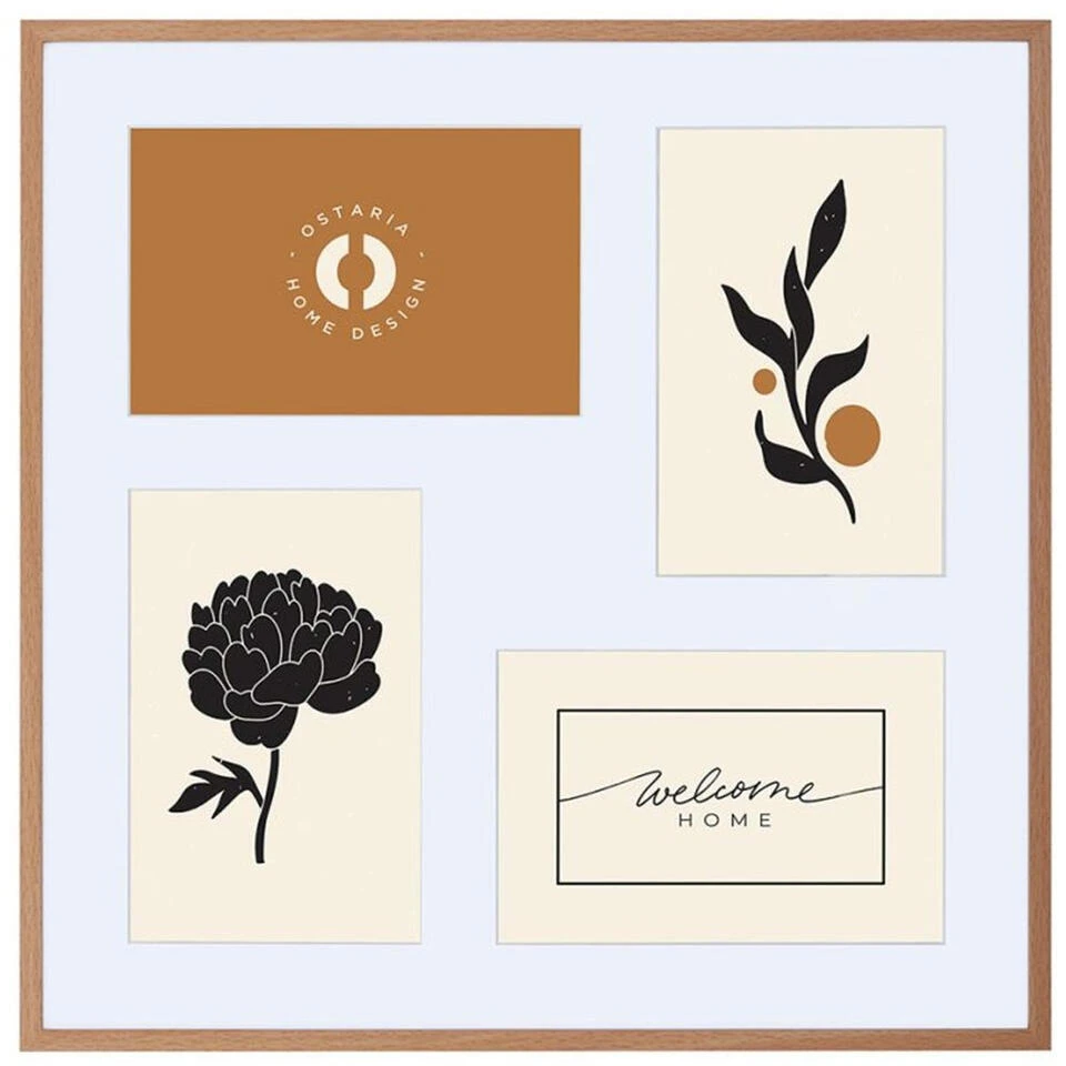 Collage fotolijst uit de Natural serie voor meerdere foto’s. Stel je foto’s tentoon met deze collage fotolijst in de kleur naturel hout met passe partout in de kleur wit. Deze moderne foto collage bestaat uit 4x fotolijstjes voor foto’s met afmetingen van 10 x 15 cm. Materiaal: hout/glas. Merk: Ostaria. Voorzien van ophangingen op deze op te hangen. Formaat: 32 x 32 cm. Wissellijst.