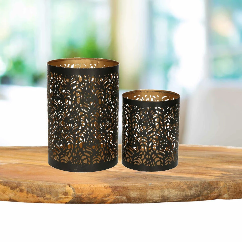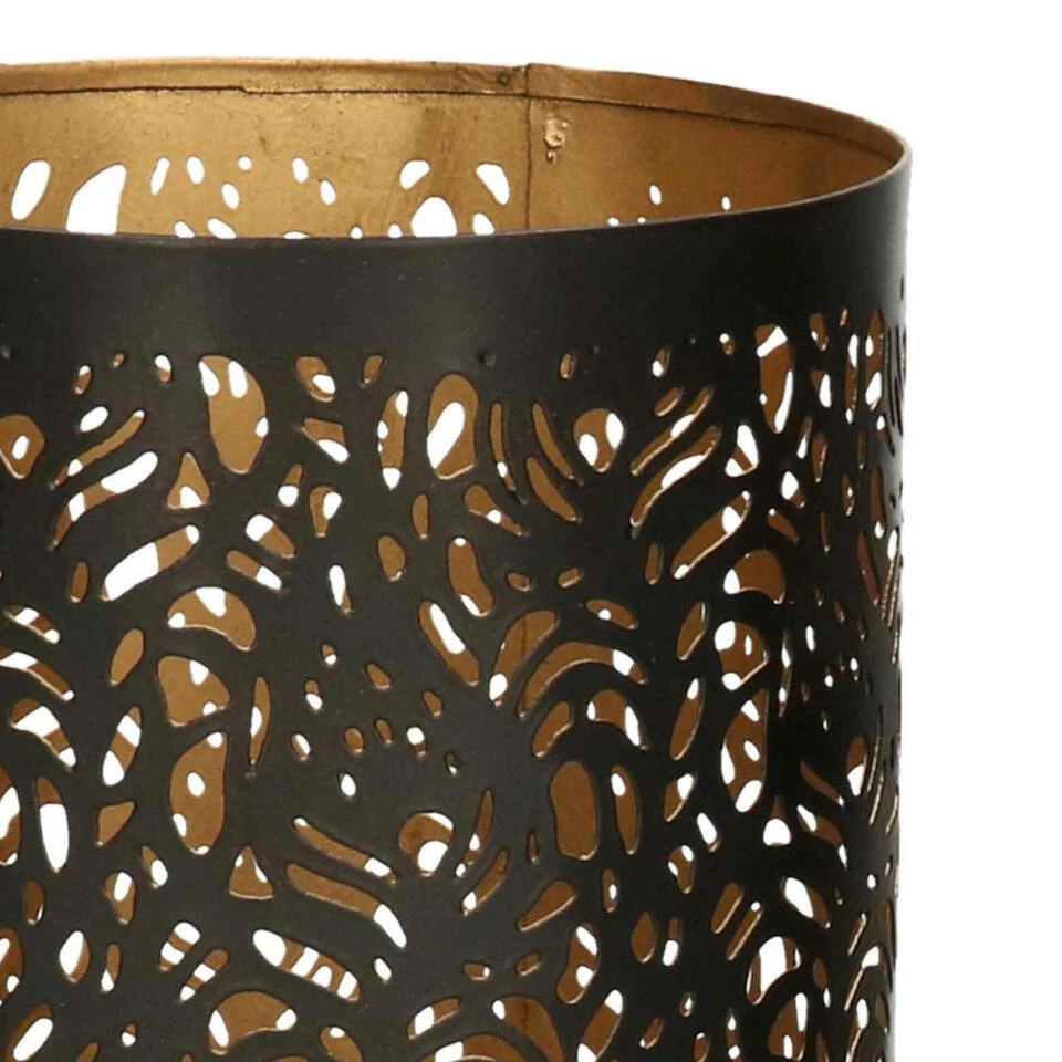 Windlichten set van 2x stuks met motief. Deze theelichthouders zijn aan de buitenzijde zwart en hebben aan de binnenzijde een metallic koperen afwerking. De houders hebben twee verschillende formaten, het kleine model heeft een diameter van circa 8 cm en een hoogte van circa 10 cm. Het grotere model heeft een diameter van circa 10 cm en een hoogte van circa 15 cm.