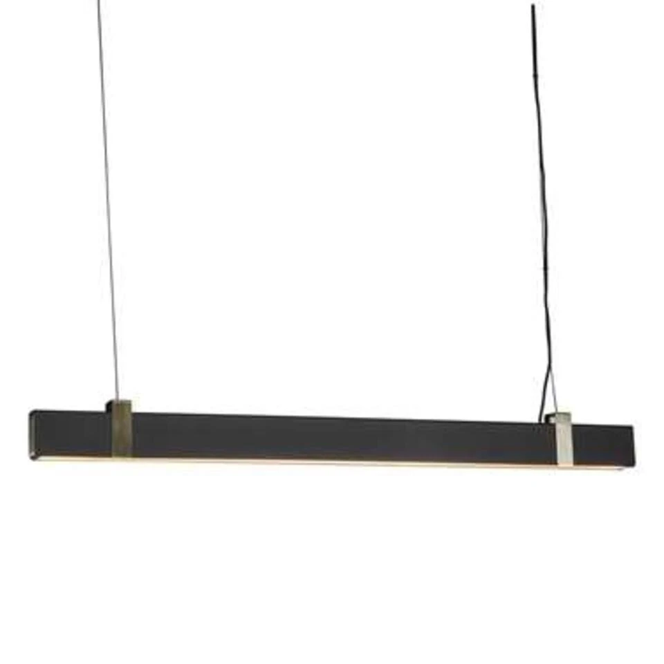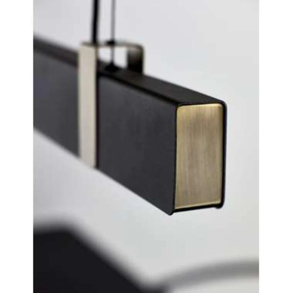 Schitterende strakke hanglamp van Nordlux die mooi pas boven een langwerpige tafel van 150 tot 225 cm. Door het langwerpig ontwerp heeft deze hanglamp een mooie lichtspreiding boven een langwerpige tafel. De lengte is 115 cm en de hoogte is 200 cm maar simpel in te korten. De breedte van de hanglamp is 4,3 cm. De LED lamp verbruikt 27 Watt en geeft 2000 Lumen aan mooi warm licht (2700 Kelvin). Kleur: zwart met messing kleurige accenten.