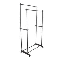 Het dubbele Orange85 kledingrek is een stijlvolle manier voor het opbergen van jouw kleding. Hiermee hang je overzichtelijk al je kleding op. Ook heeft het kledingrek wieltjes aan de onderkant waardoor verplaatsen erg makkelijk is. Het is gemaakt van kunststof/metaal en de kleur is zwart. Met de afmetingen van 80x43x160cm.