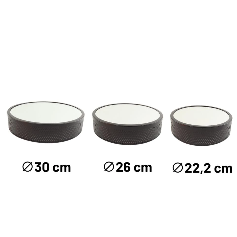 De Orange85 spiegel set bestaat uit drie ronde spiegels. De grootste spiegel heeft een diameter van 30cm. De middelste maat heeft een diameter 26cm en de kleinste maat heeft een diameter van 22,2cm. Om de spiegel zit een zwarte rand.