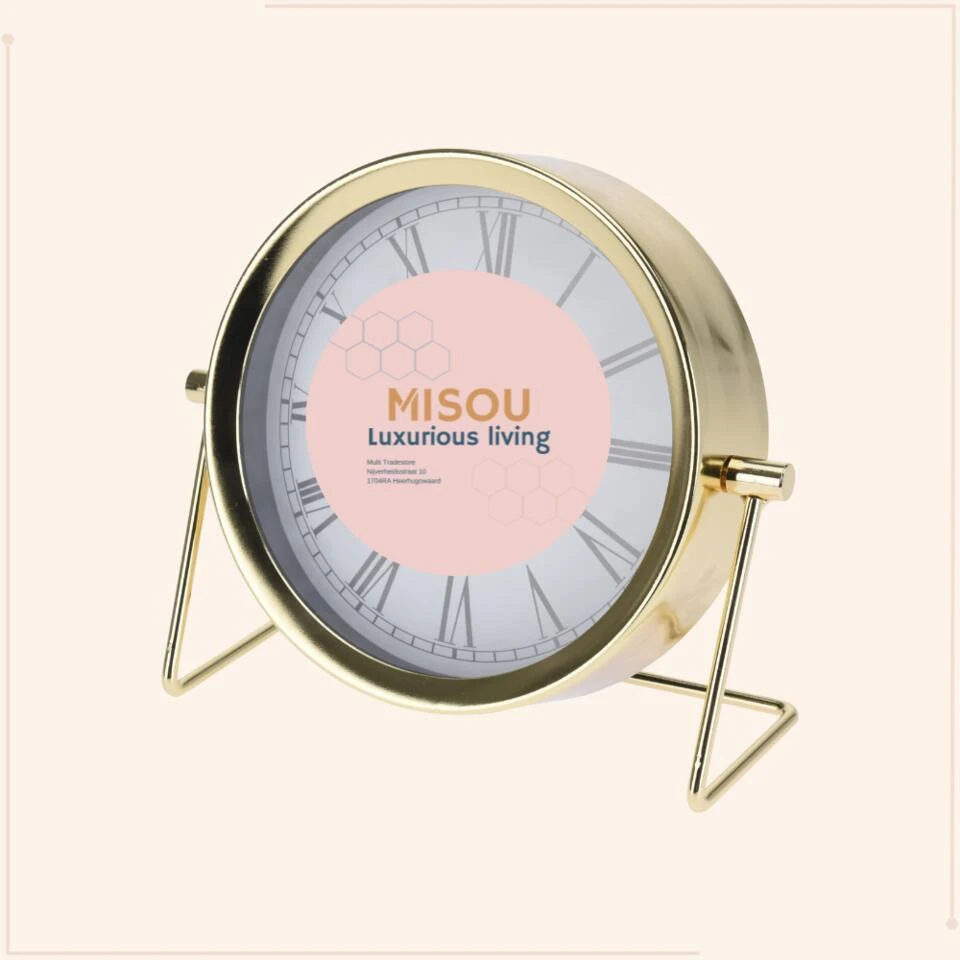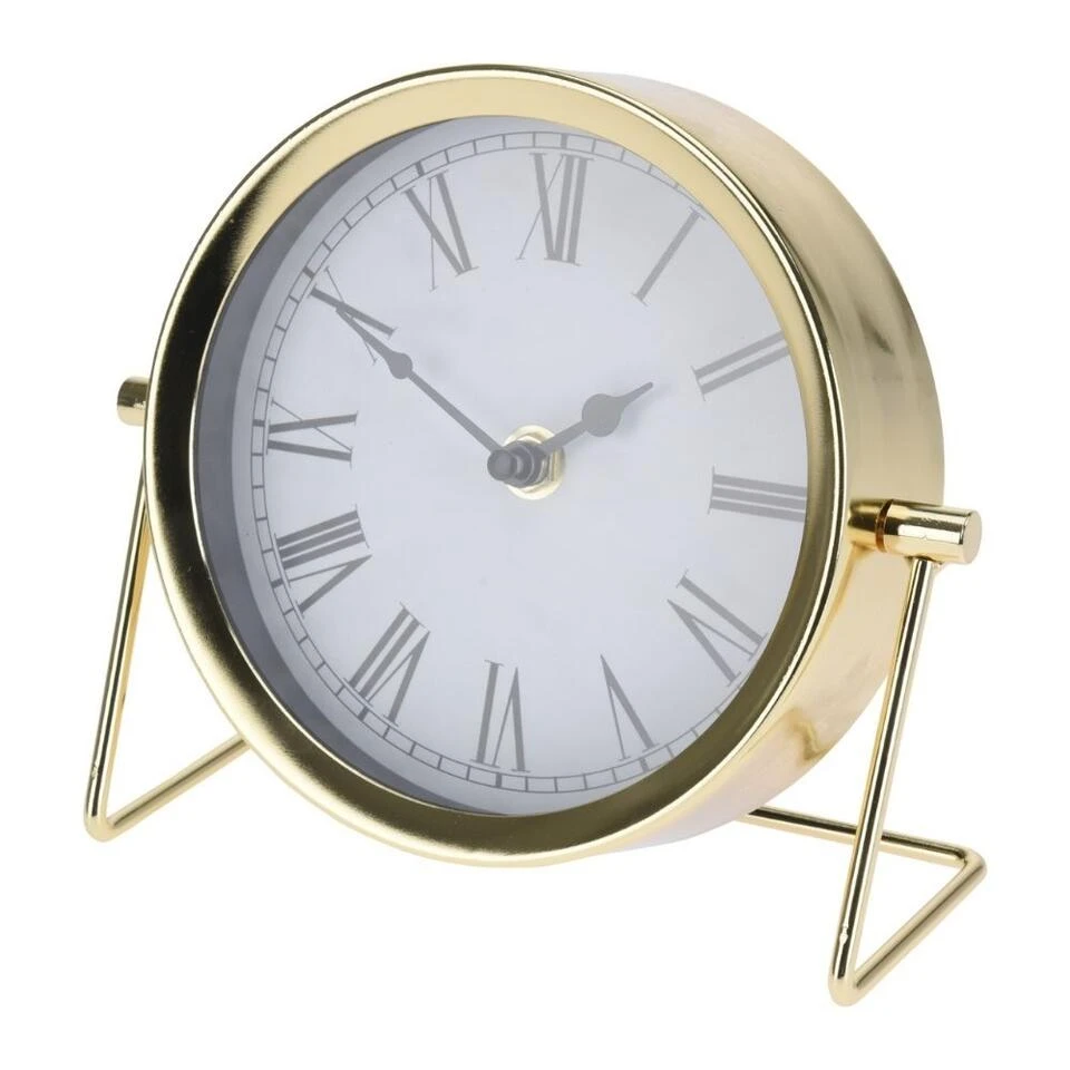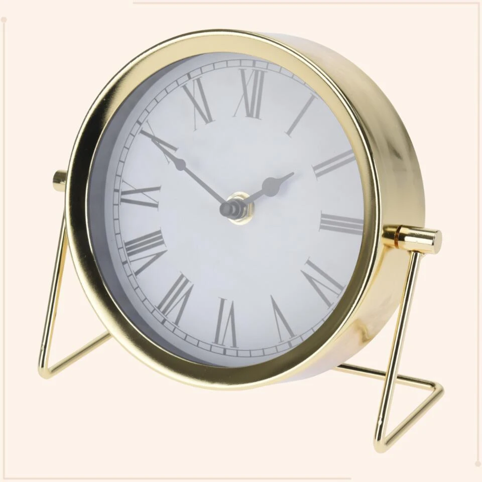 Klassieke Tafelklok goud van Orange85. De klok staat op een standaard en kan versteld worden. Het model is uitgevoerd in een klassieke stijl, en heeft een contrasterende zwart-witte wijzerplaat met grote Romeinse cijfers. De diameter van de klok is 16 cm. De klok werkt op 1x AA batterij, deze is niet meegeleverd.