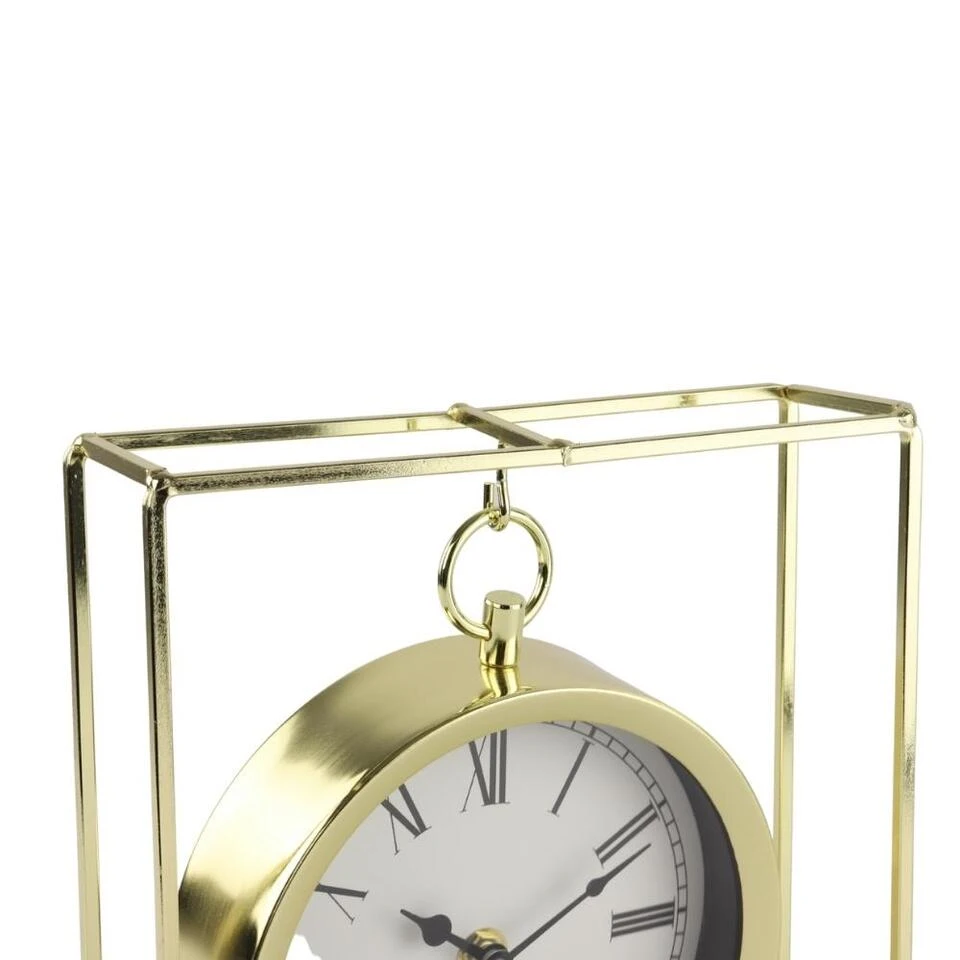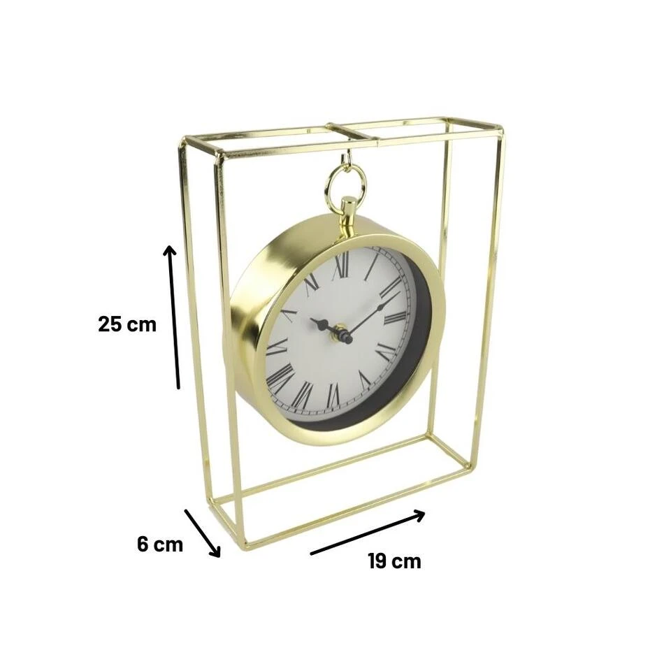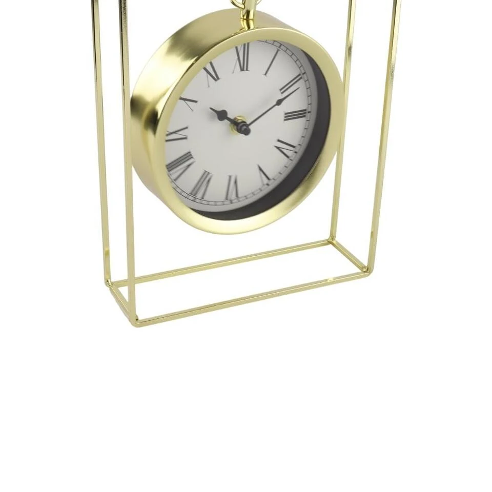 Tafelklok goud van Orange85. De klok is een hangmodel met een vierkante omhulsing. Valt op door de Romeinse wijzerplaat. Decoratiestuk voor in de woonkamer. De klok is gemaakt van metaal met daarover een goudkleurige laag.